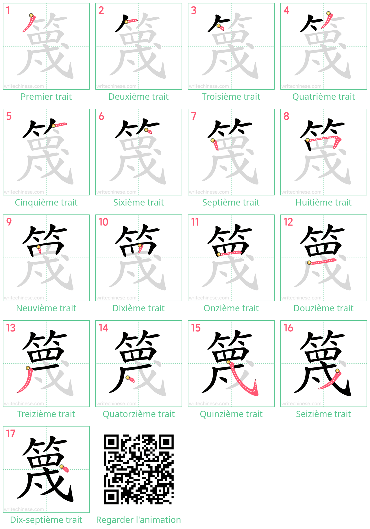 Maîtrisez le caractère chinois '篾' trait par trait grâce à des instructions visuelles étape par étape.