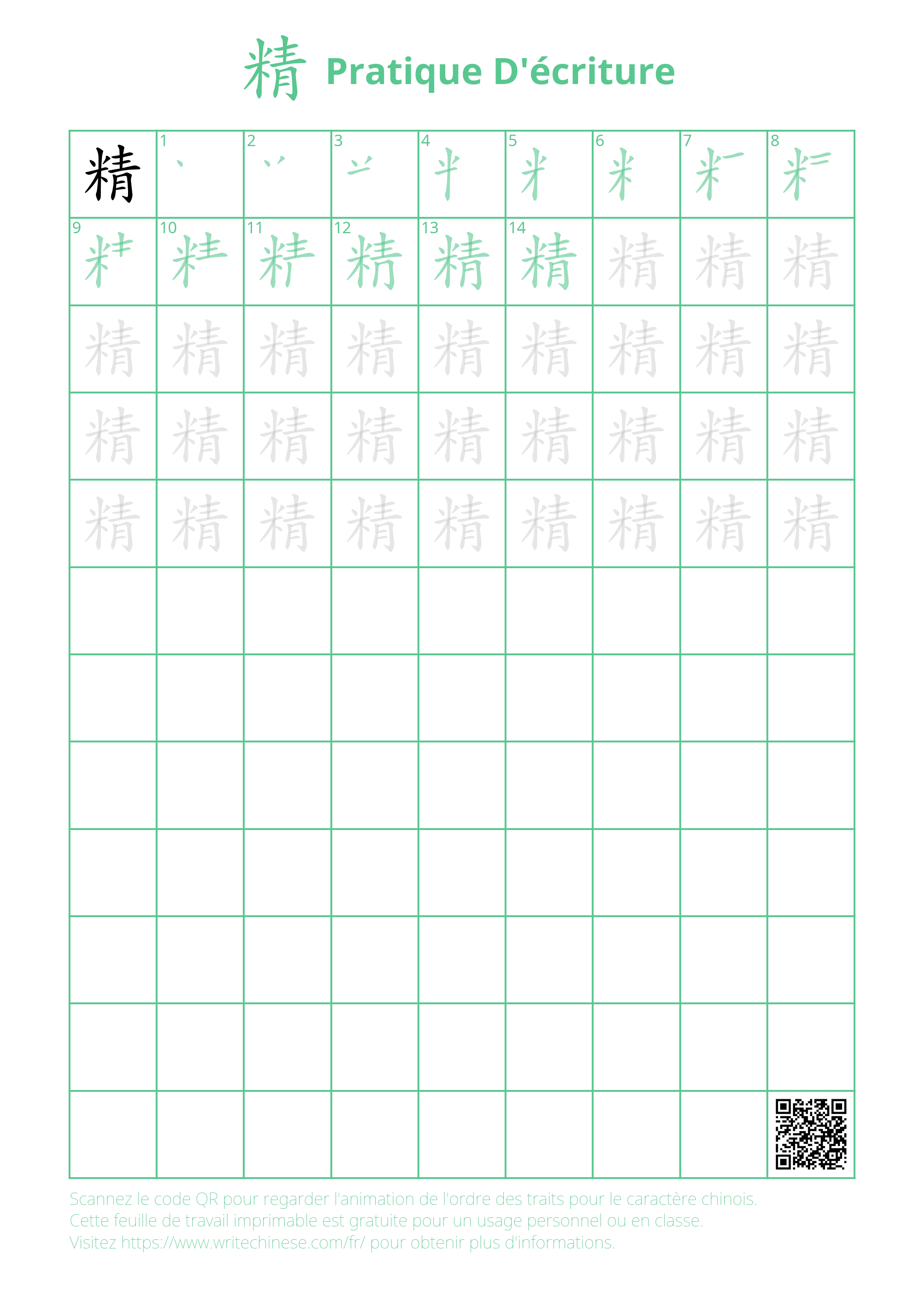 calligraphie pour écrire le caractère chinois '精'. Vous pouvez télécharger les fiches