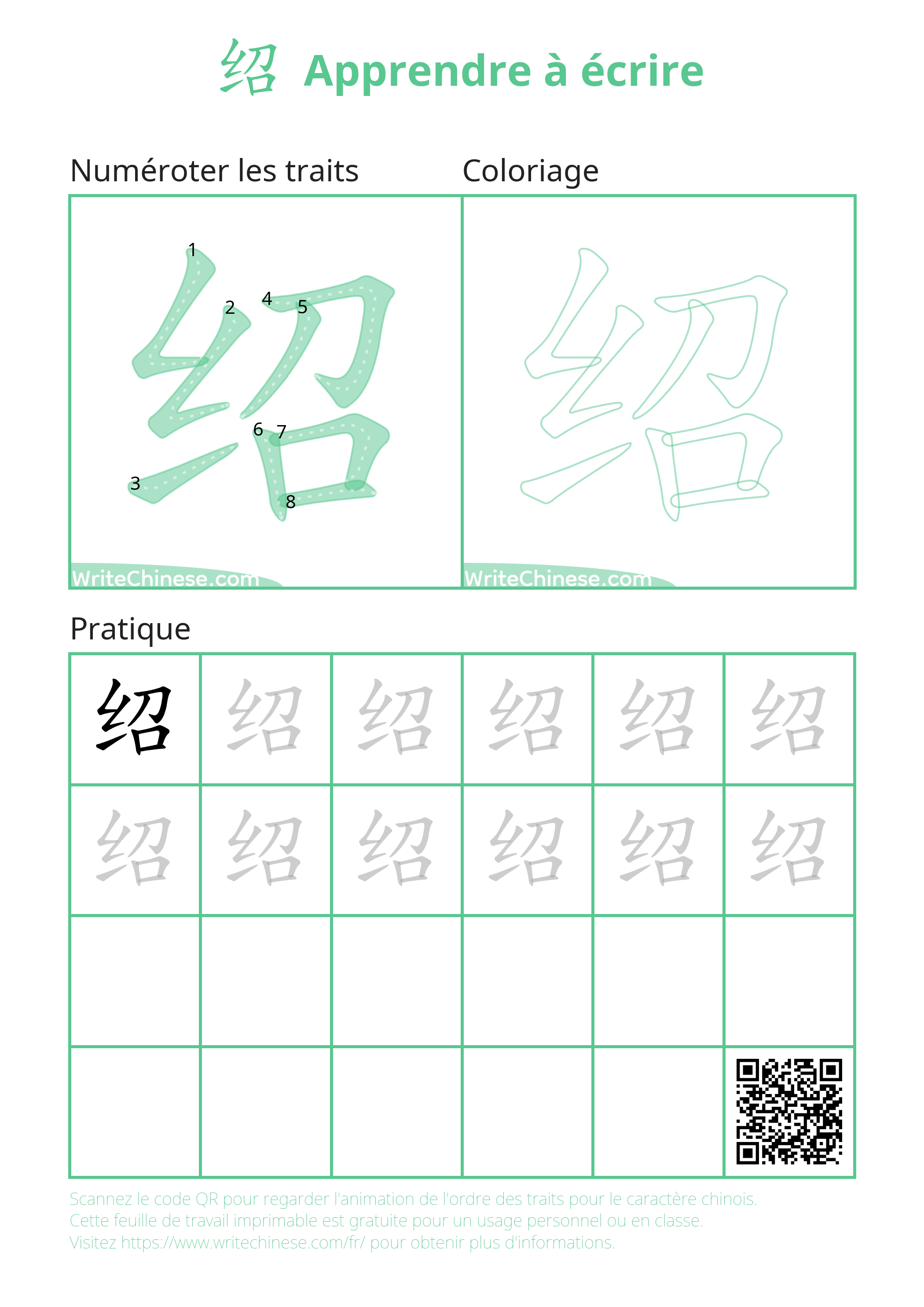 Feuille d'exercice imprimable pour la pratique de l'ordre des traits du caractère chinois 绍