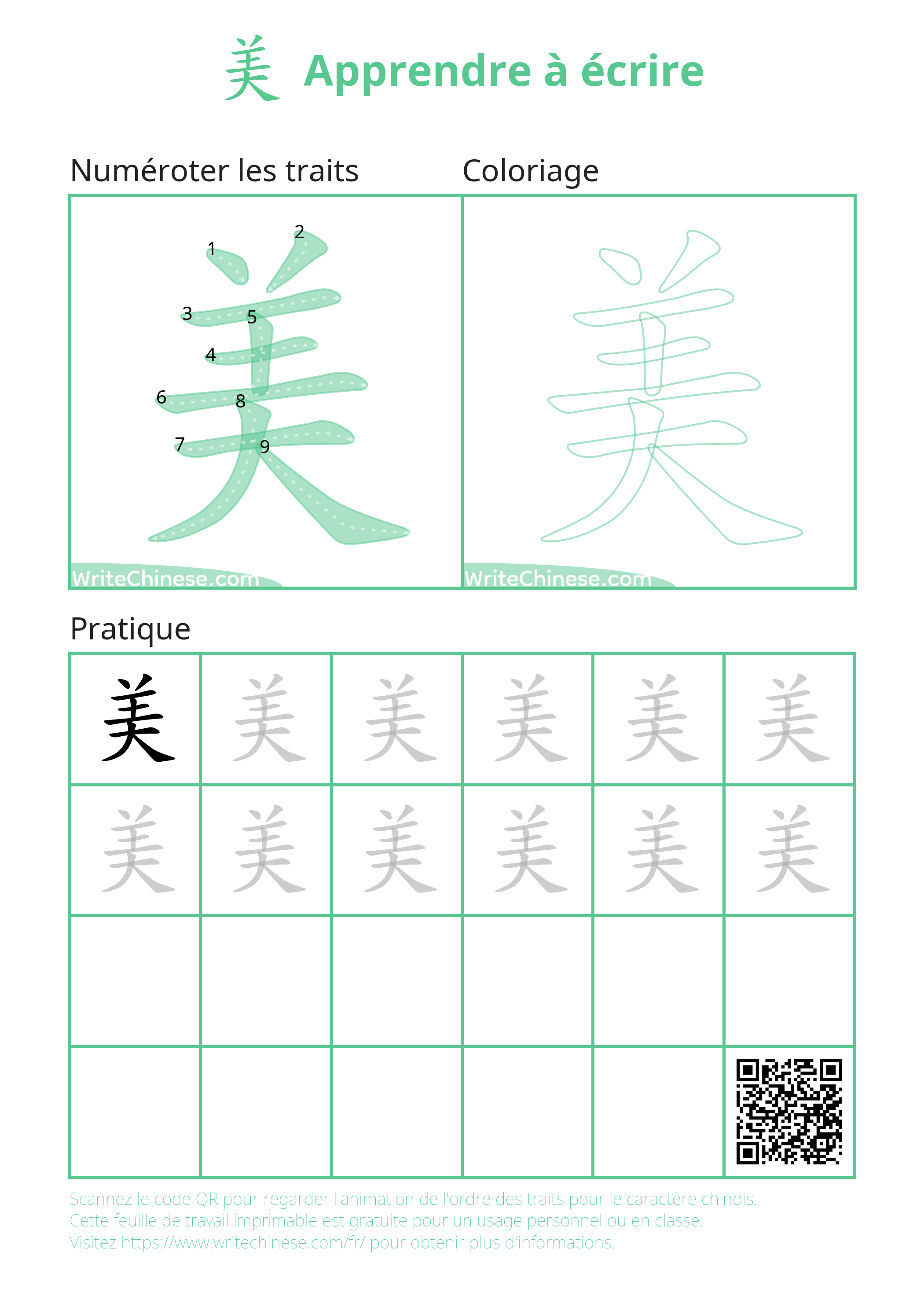 Feuille d'exercice imprimable pour la pratique de l'écriture du caractère chinois 美