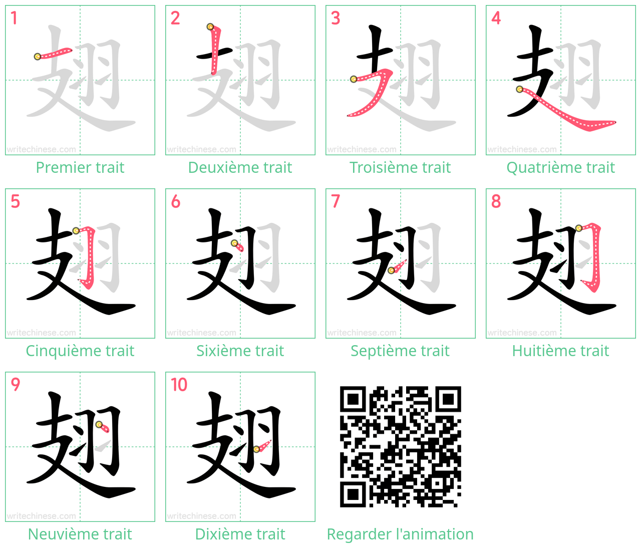 calligraphie pour écrire le caractère chinois '翅'. Vous pouvez télécharger les fiches