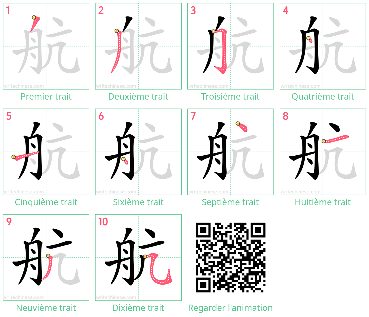 Apprenez à écrire le caractère chinois "航" en regardant l'animation de l'ordre des traits de "航".