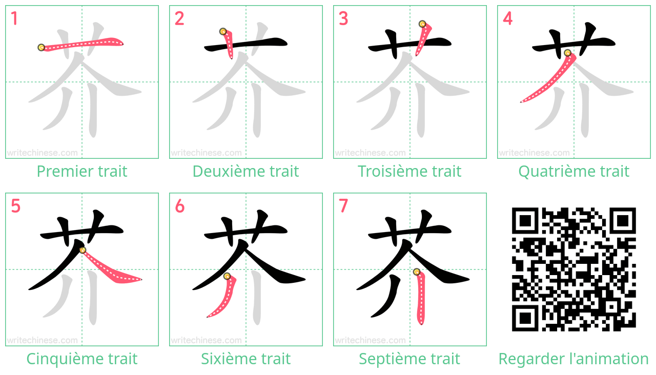 Apprenez à écrire le caractère chinois "芥" en regardant l'animation de l'ordre des traits