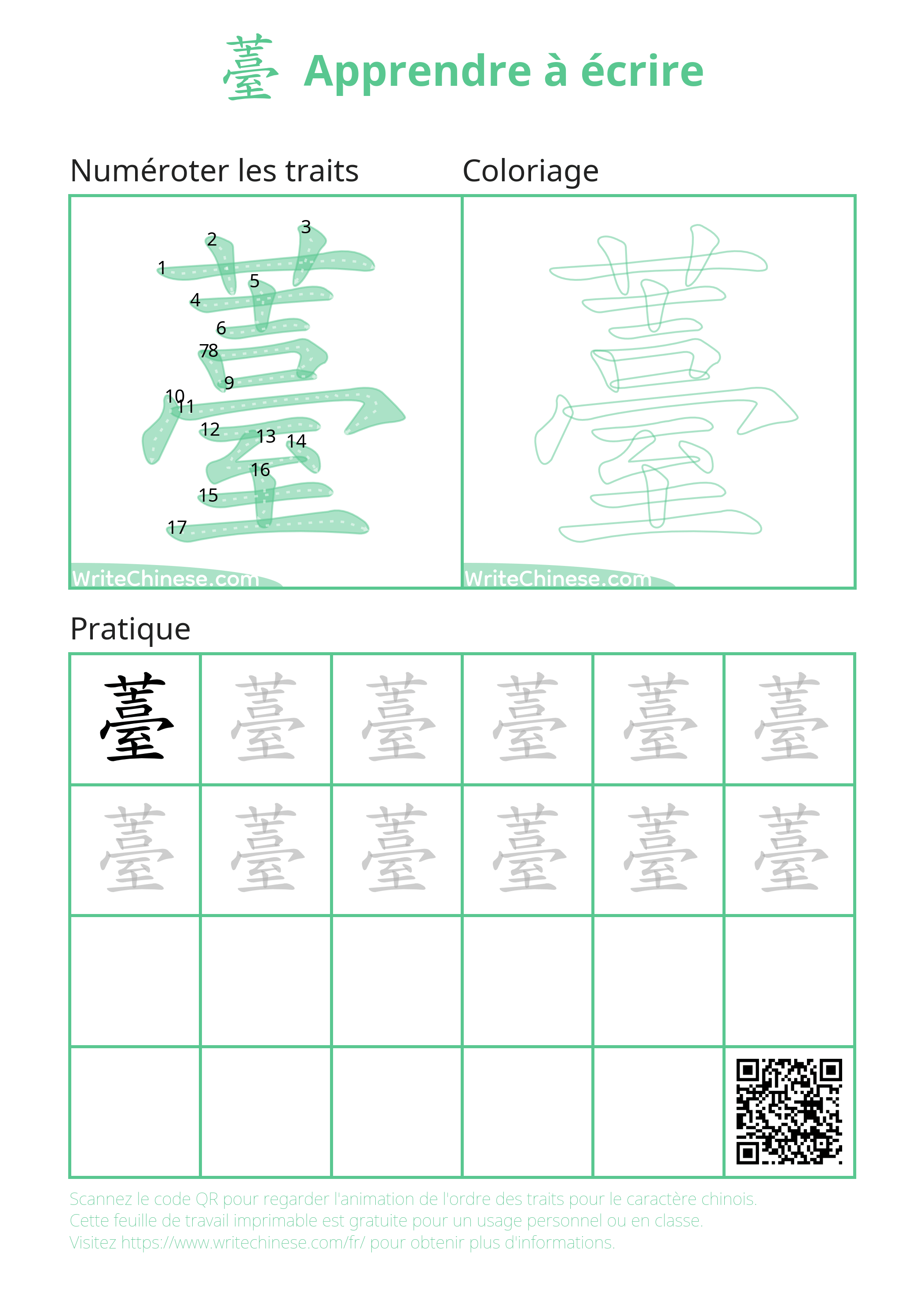 Apprenez la bonne manière d'écrire le caractère chinois '薹' grâce à un tutoriel vidéo avec un professeur de calligraphie. Suivez le guide étape par étape du maître de la calligraphie pour écrire le caractère chinois '薹'. Vous pouvez télécharger les fiches d'écriture manuscrite imprimables ci-dessous et pratiquer en écrivant avec un stylo et du papier.