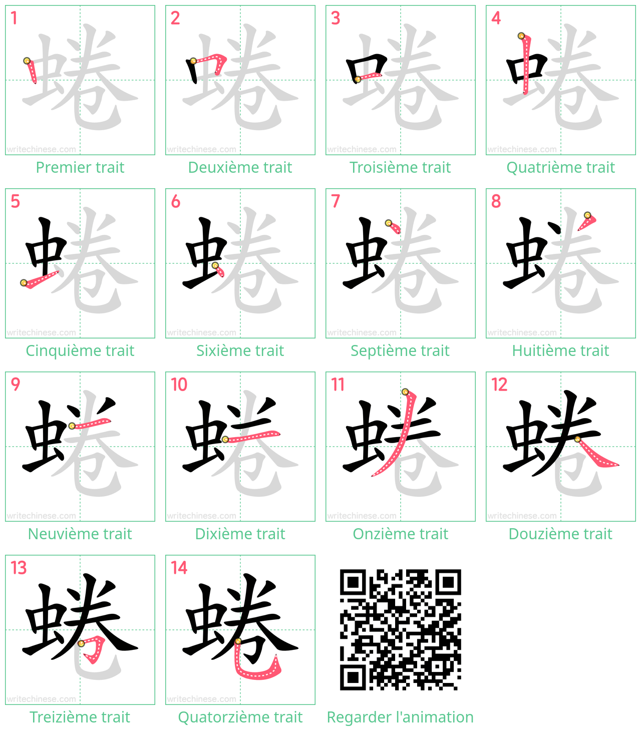 Apprenez à écrire le caractère chinois "蜷" en regardant l'animation de l'ordre des traits de "蜷".