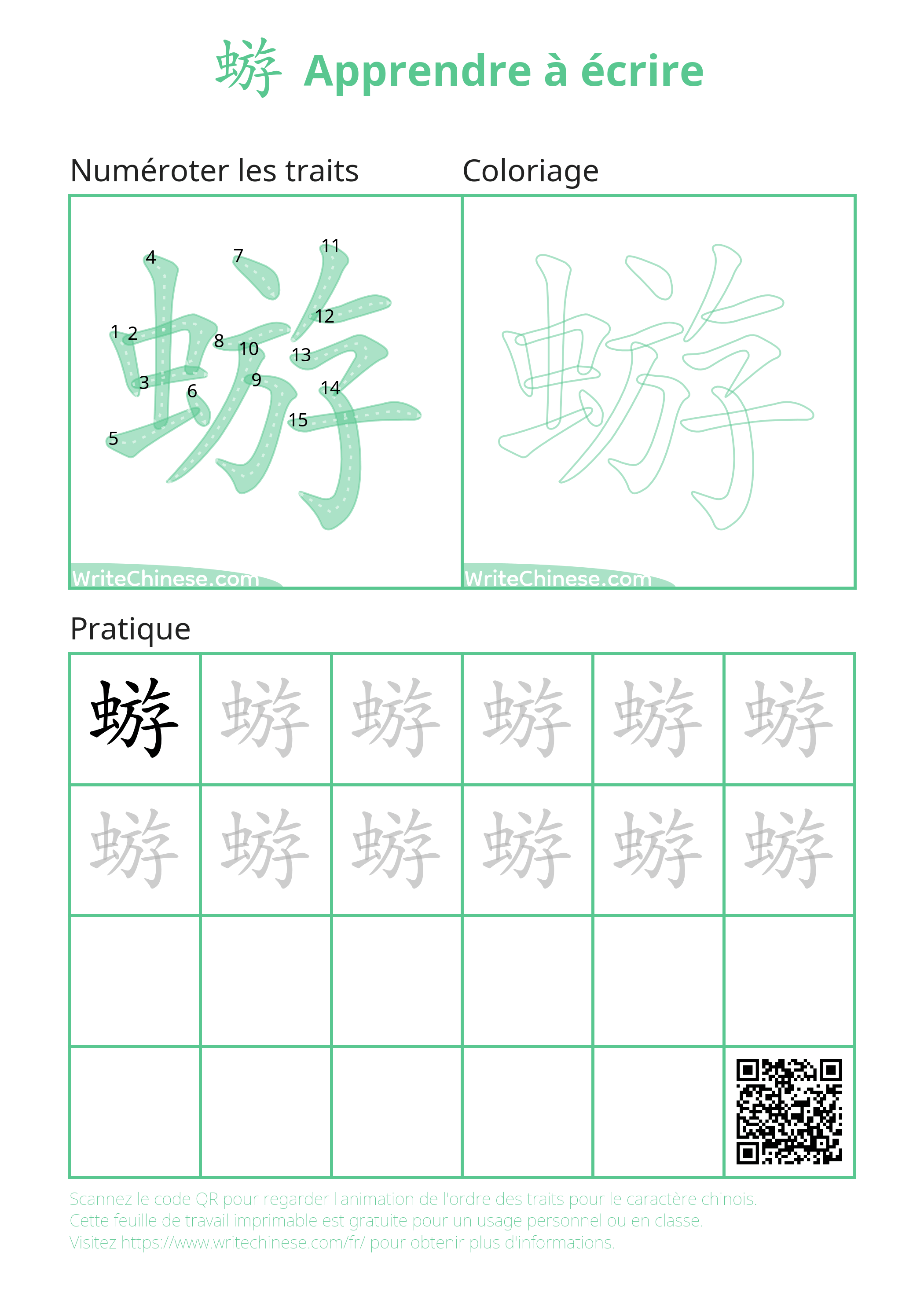 Apprenez la bonne manière d'écrire le caractère chinois '蝣' grâce à un tutoriel vidéo avec un professeur de calligraphie. Suivez le guide étape par étape du maître de la calligraphie pour écrire le caractère chinois '蝣'. Vous pouvez télécharger les fiches d'écriture manuscrite imprimables ci-dessous et pratiquer en écrivant avec un stylo et du papier.