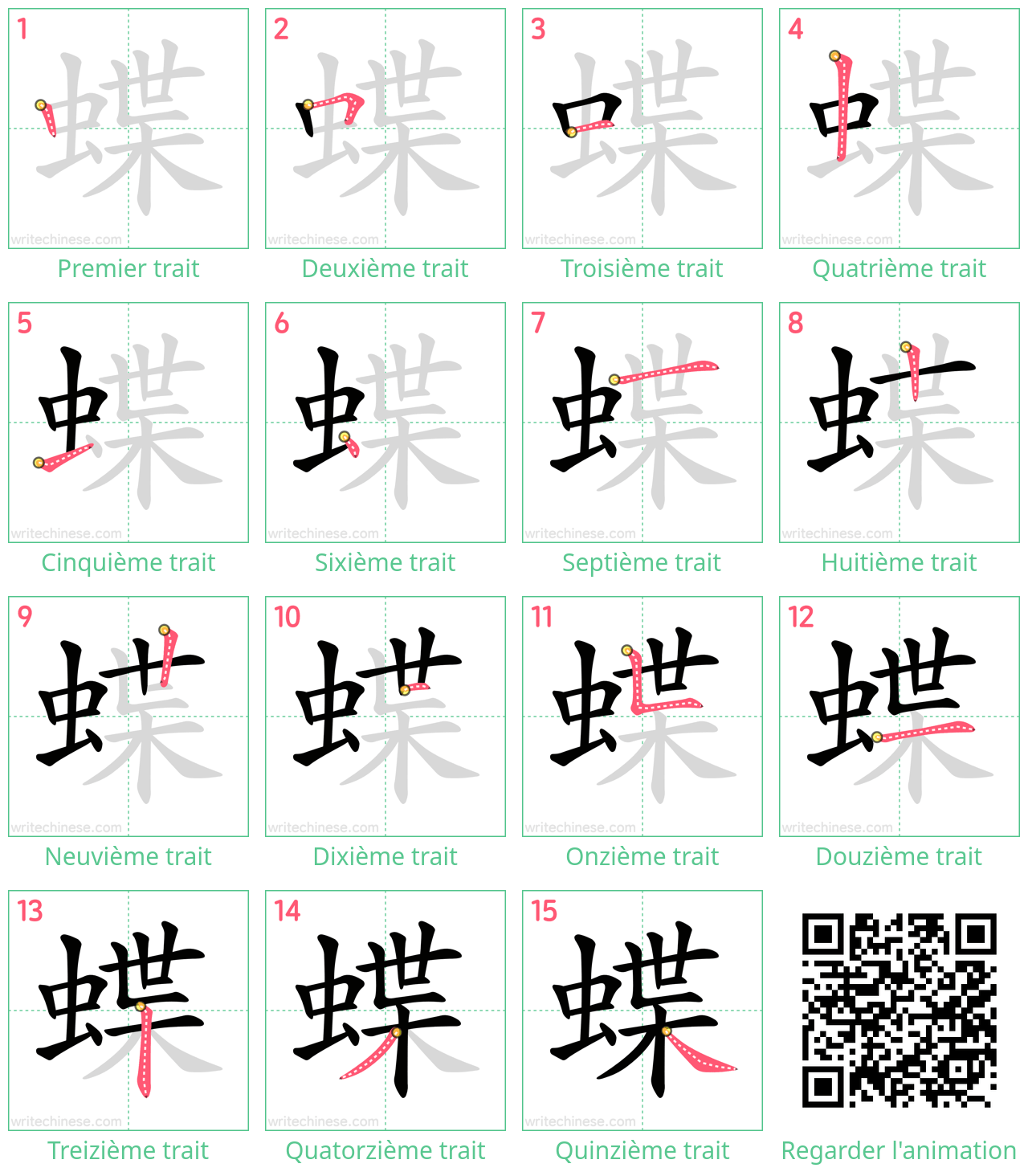 Apprenez à écrire le caractère chinois "蝶" en regardant l'animation de l'ordre des traits