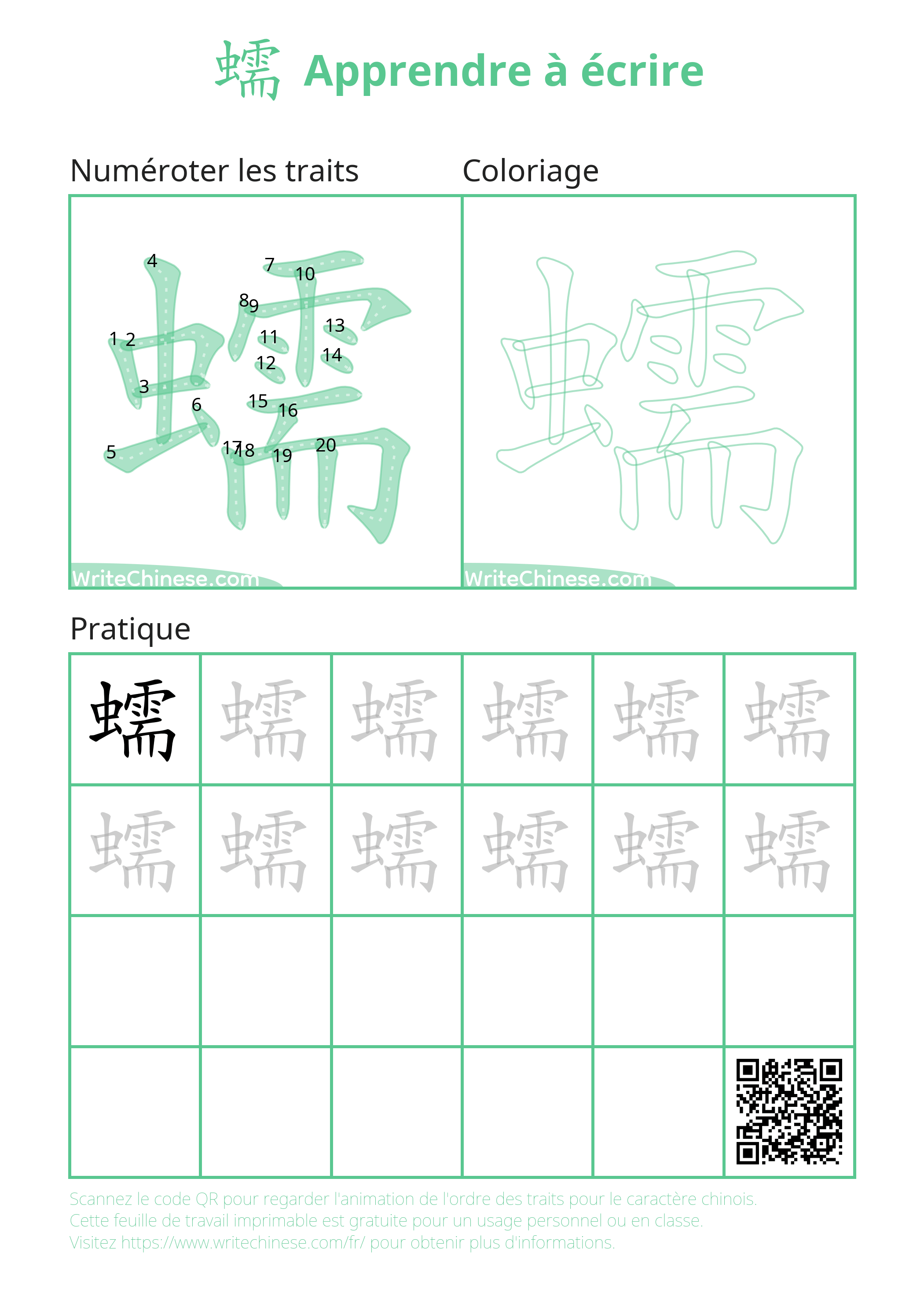 Apprenez la bonne manière d'écrire le caractère chinois '蠕' grâce à un tutoriel vidéo avec un professeur de calligraphie. Suivez le guide étape par étape du maître de la calligraphie pour écrire le caractère chinois '蠕'. Vous pouvez télécharger les fiches d'écriture manuscrite imprimables ci-dessous et pratiquer en écrivant avec un stylo et du papier.