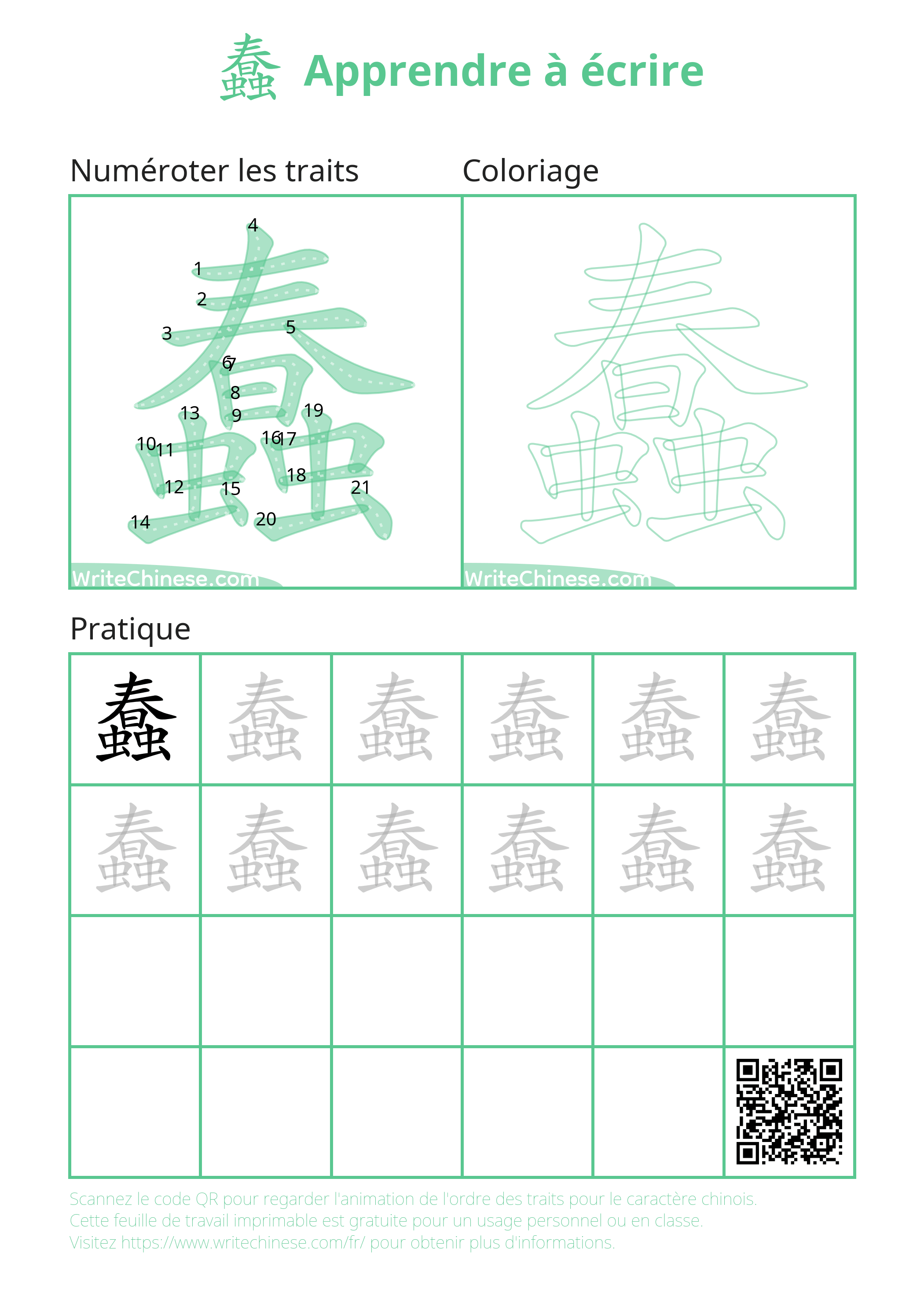 Apprenez la bonne manière d'écrire le caractère chinois '蠢' grâce à un tutoriel vidéo avec un professeur de calligraphie. Suivez le guide étape par étape du maître de la calligraphie pour écrire le caractère chinois '蠢'. Vous pouvez télécharger les fiches d'écriture manuscrite imprimables ci-dessous et pratiquer en écrivant avec un stylo et du papier.
