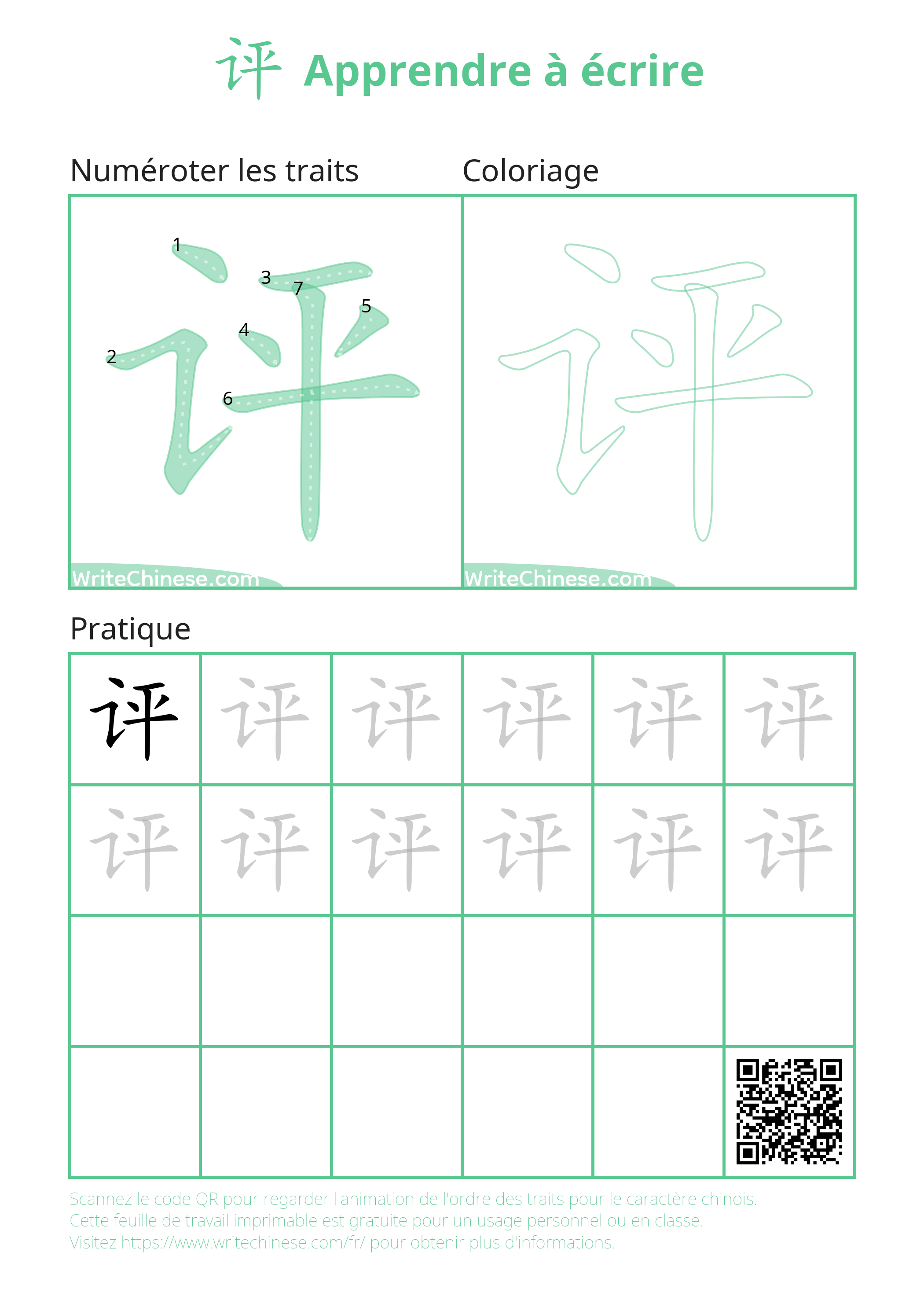 calligraphie pour écrire le caractère chinois '评'. Vous pouvez télécharger les fiches