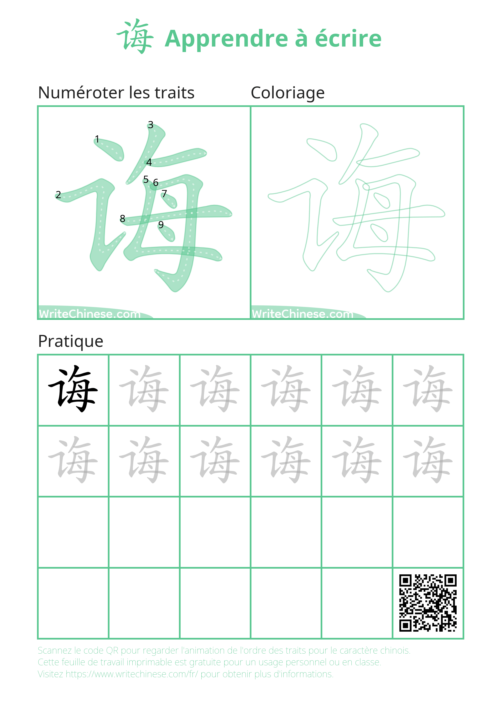 Apprenez la bonne manière d'écrire le caractère chinois '诲' grâce à un tutoriel vidéo avec un professeur de calligraphie. Suivez le guide étape par étape du maître de la calligraphie pour écrire le caractère chinois '诲'. Vous pouvez télécharger les fiches d'écriture manuscrite imprimables ci-dessous et pratiquer en écrivant avec un stylo et du papier.