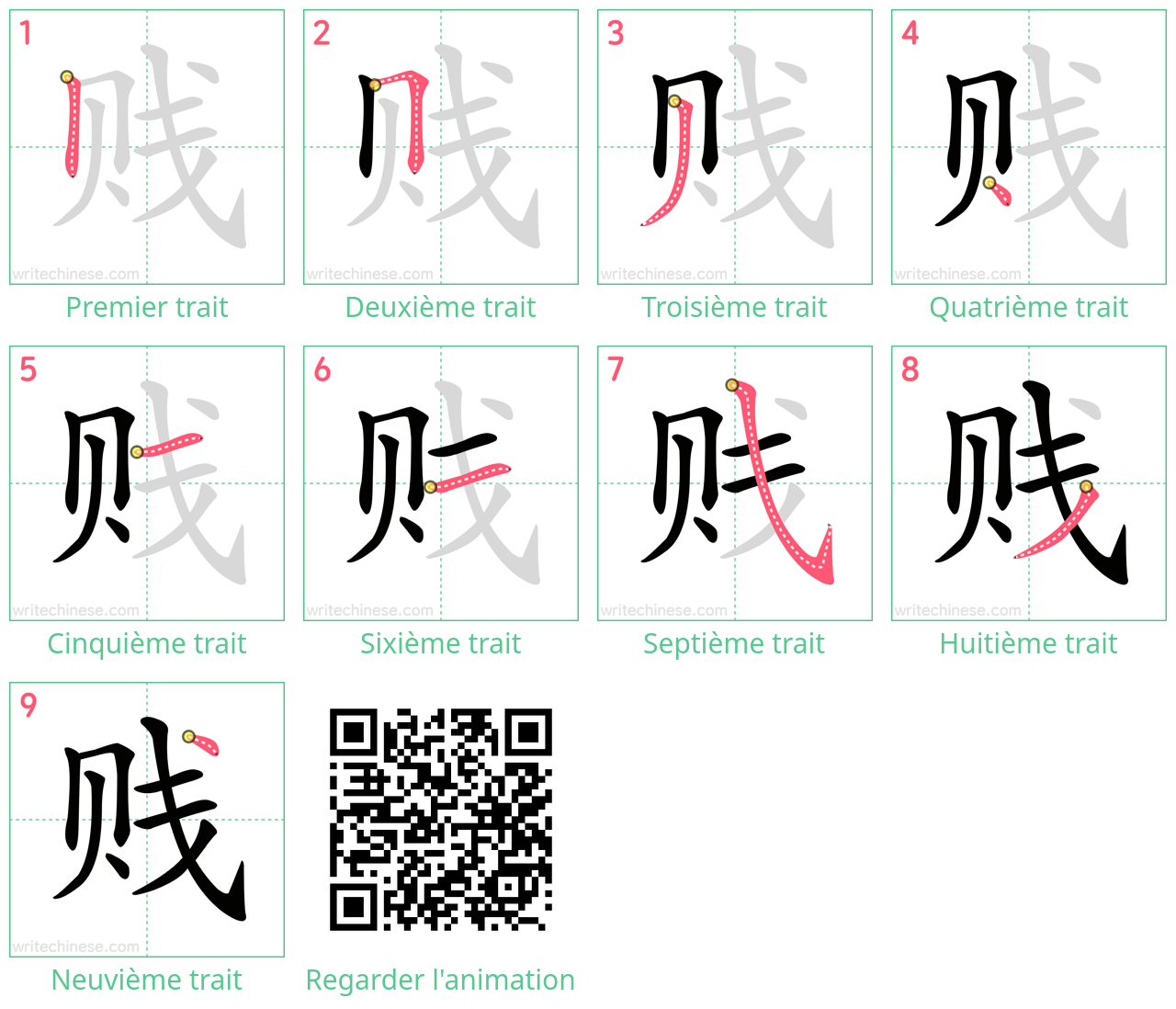 Apprenez à écrire le caractère chinois "贱" en regardant l'animation de l'ordre des traits de "贱".