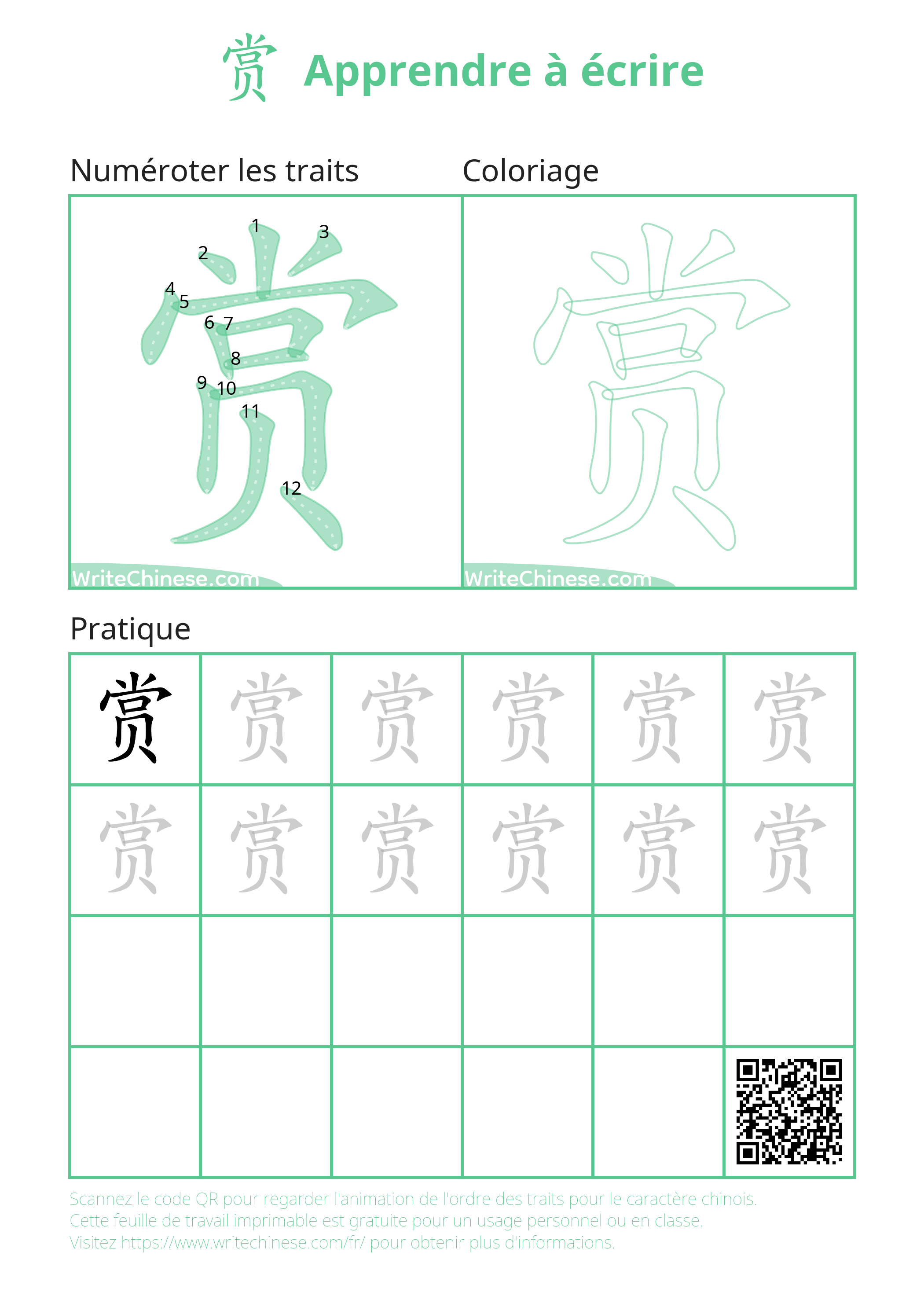 calligraphie pour écrire le caractère chinois '赏'. Vous pouvez télécharger les fiches