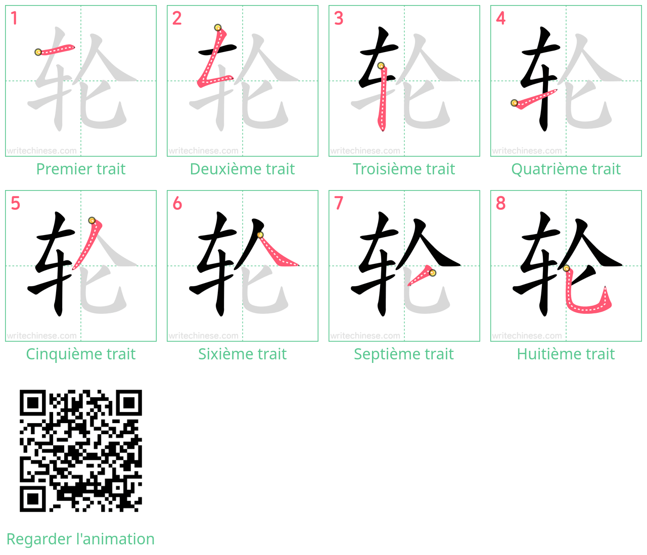 Apprenez à écrire le caractère chinois "轮" en regardant l'animation de l'ordre des traits