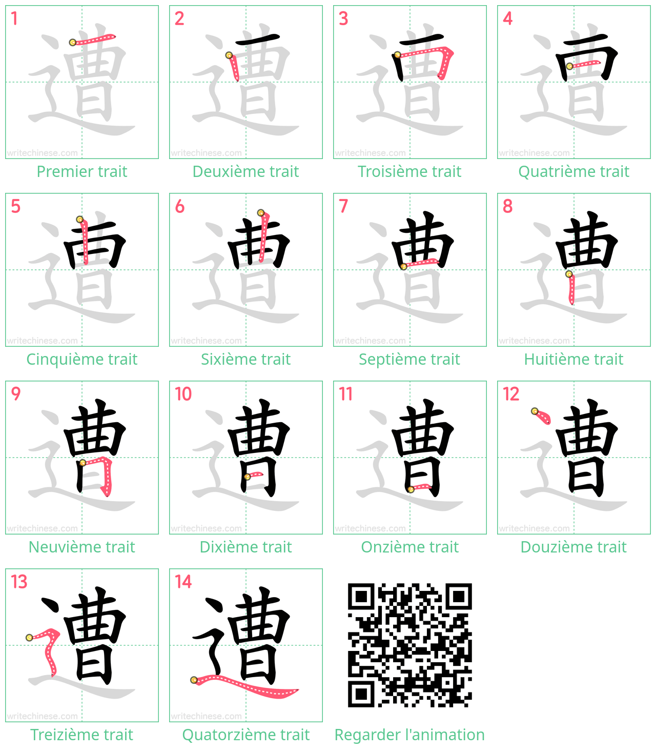 Apprenez à écrire le caractère chinois "遭" en regardant l'animation de l'ordre des traits de "遭".