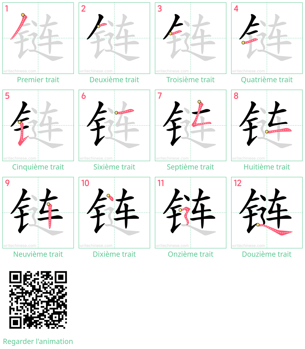 Apprenez à écrire le caractère chinois "链" en regardant l'animation de l'ordre des traits