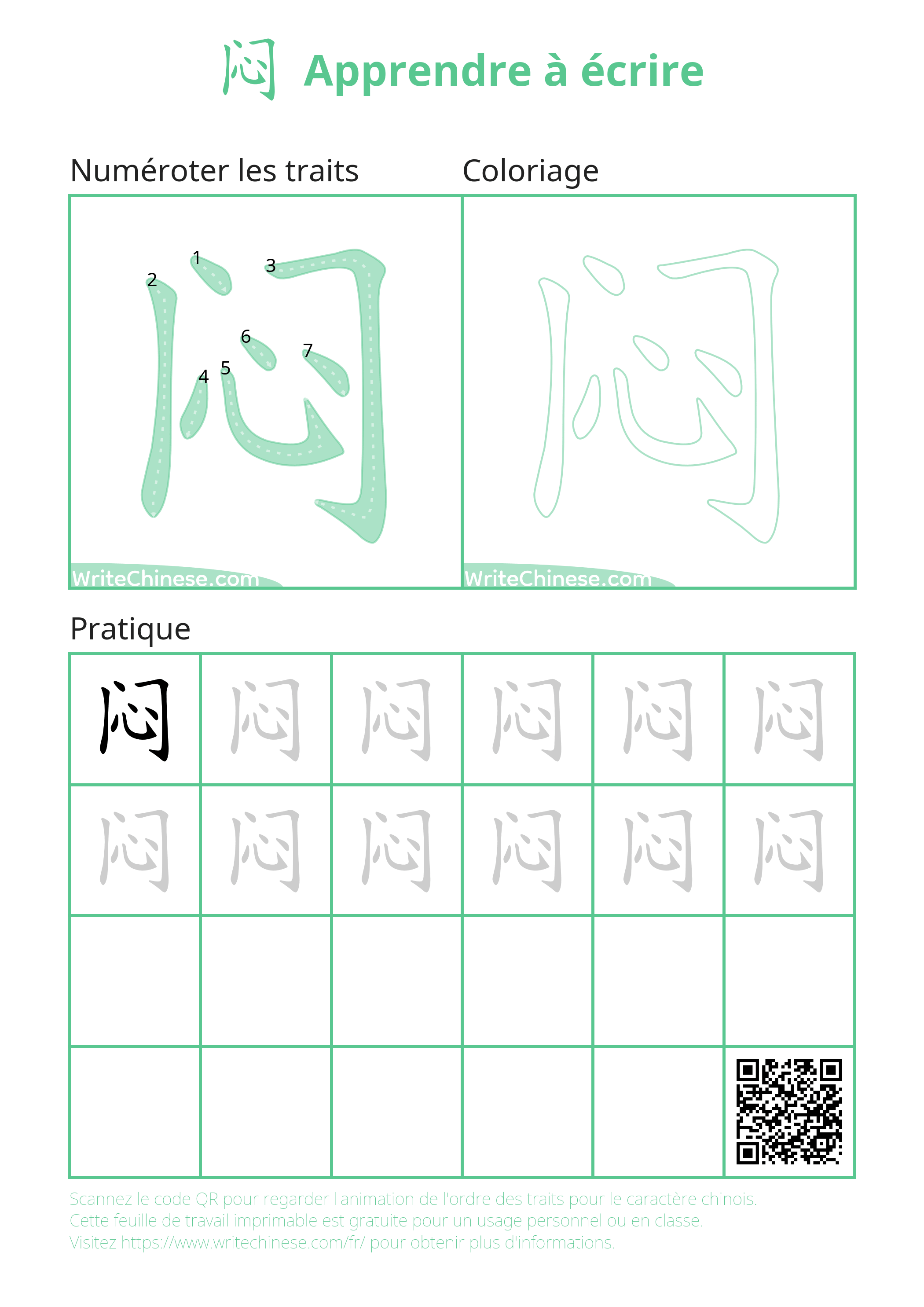calligraphie pour écrire le caractère chinois '闷'. Vous pouvez télécharger les fiches
