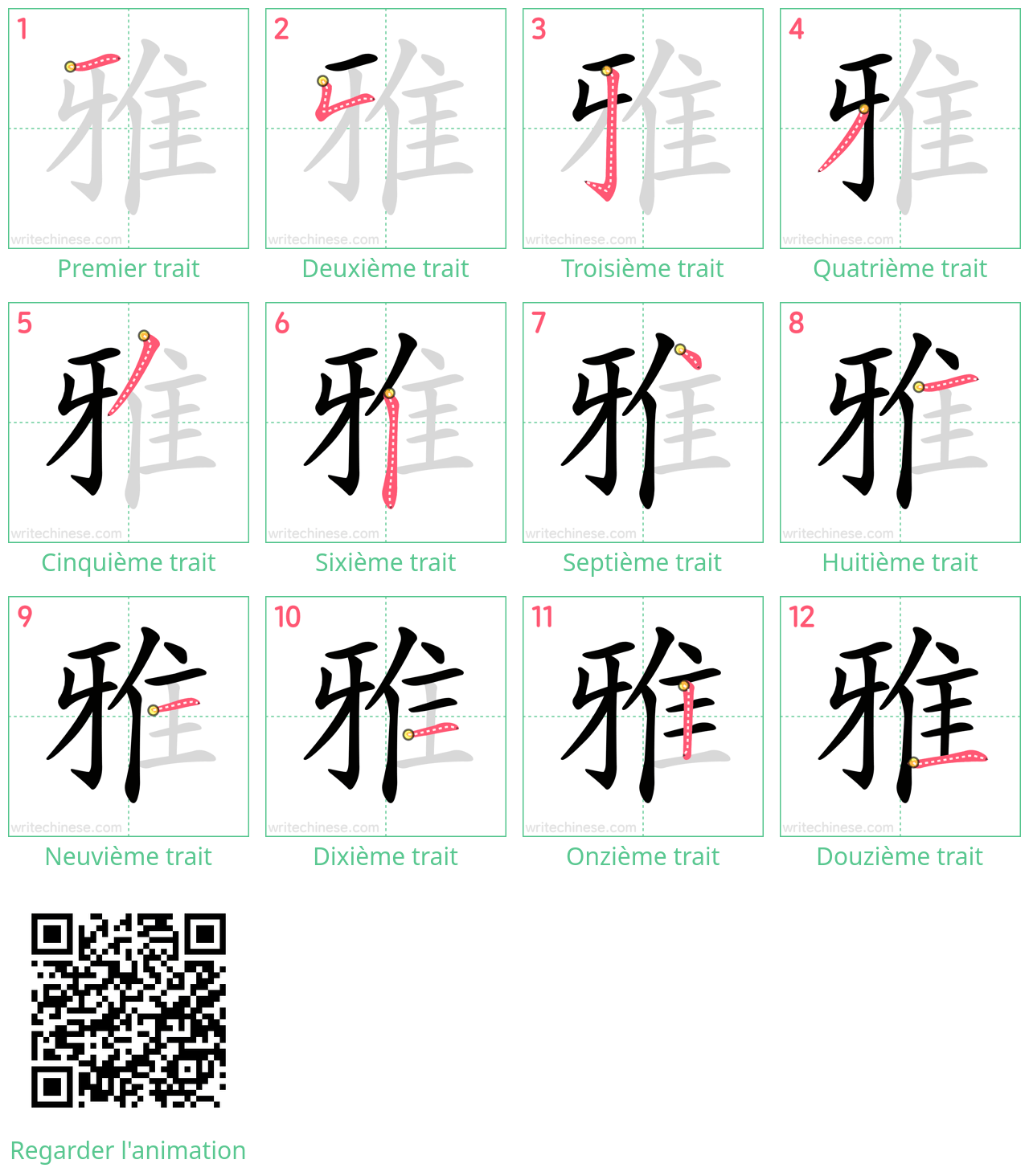 Apprenez à écrire le caractère chinois "雅" en regardant l'animation de l'ordre des traits de "雅".