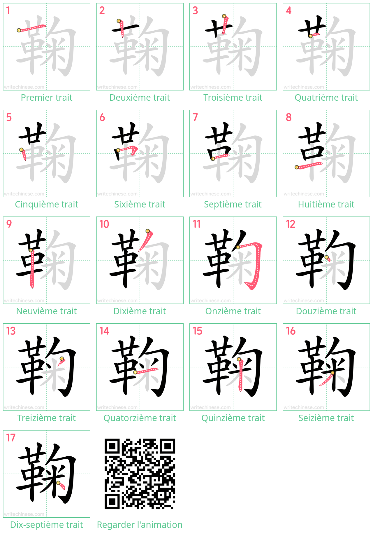 Apprenez à écrire le caractère chinois "鞠" en regardant l'animation de l'ordre des traits