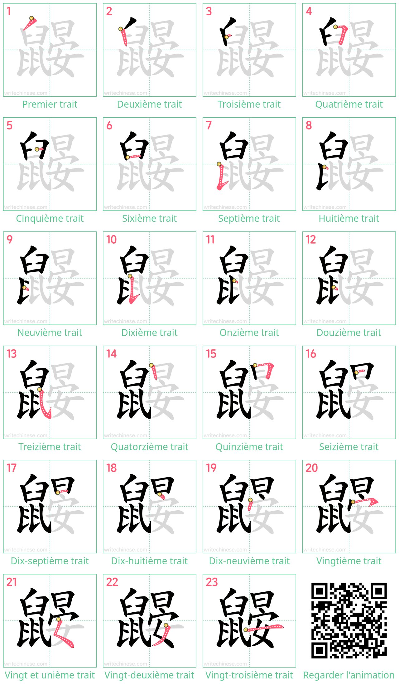 Feuille d'exercice imprimable pour la pratique de l'ordre des traits du caractère chinois 鼹