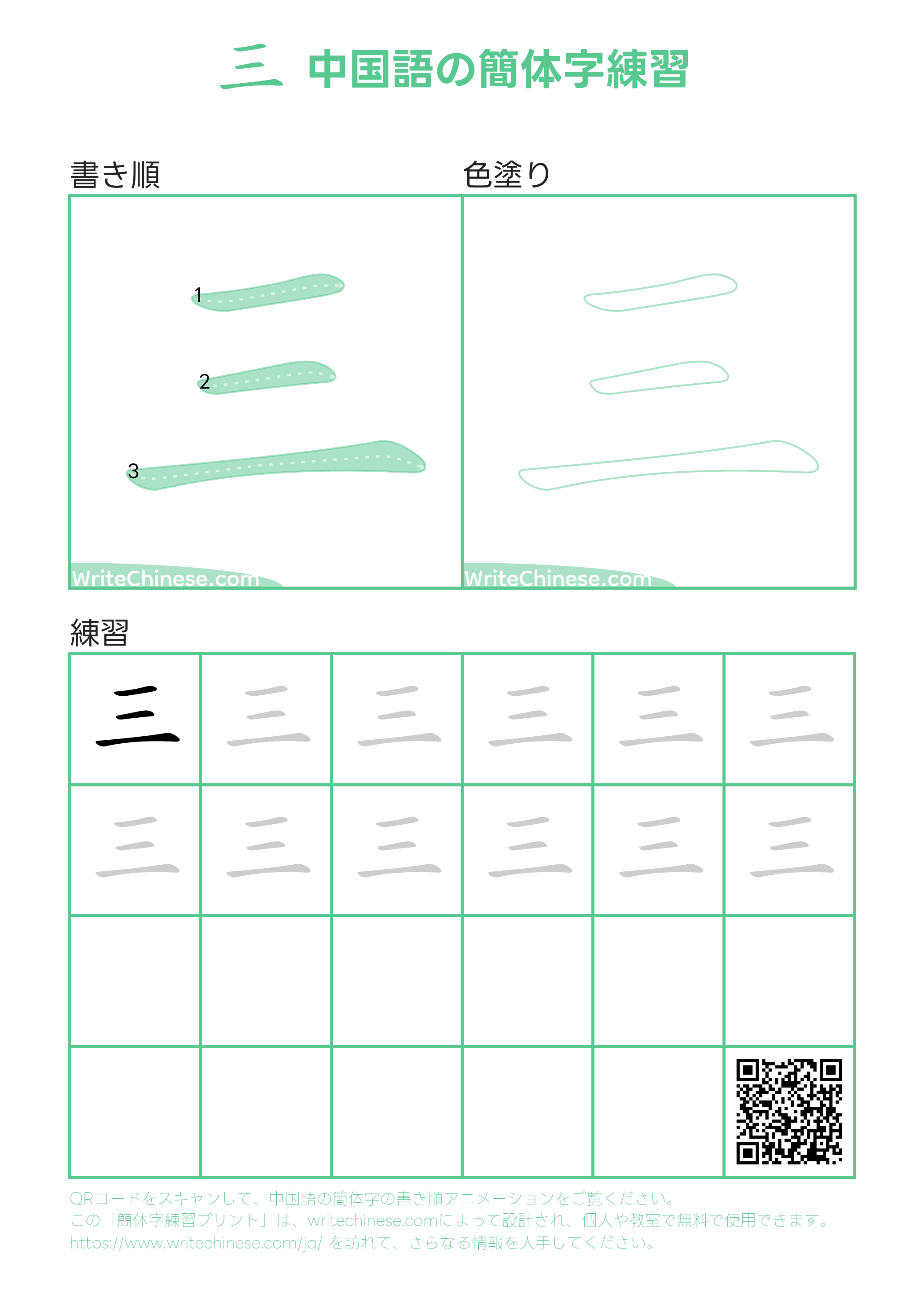書道の先生によるビデオチュートリアルで、中国語「三」の正しい書き方を学びましょう。書道の達人によるステップバイステップのガイドに従って、中国語「三」を書きましょう。以下の印刷可能な手書き用のワークシートをダウンロードして、ペンと紙で一緒に書く練習をしましょう。