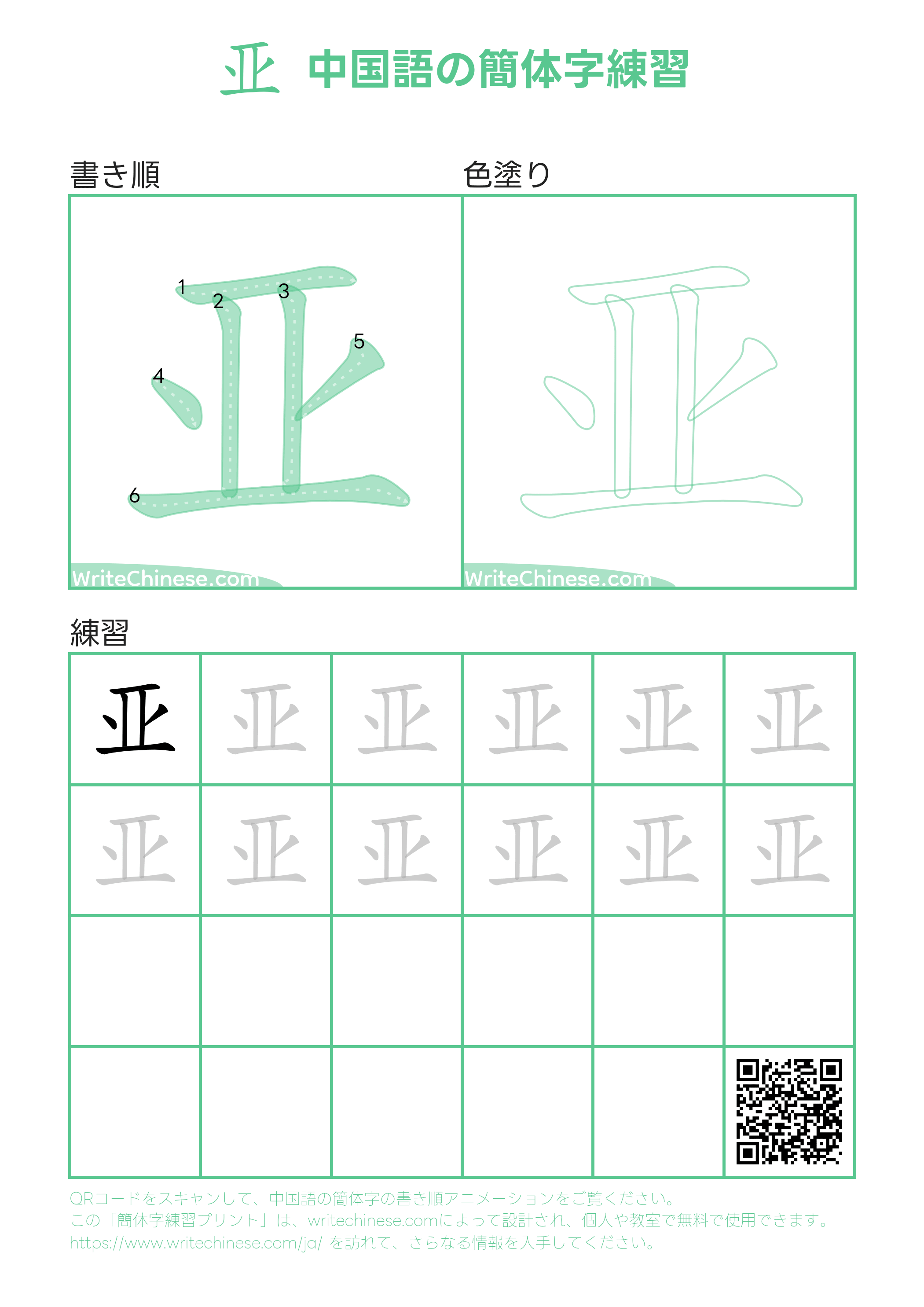 中国語の簡体字「亚」の書き順練習用の印刷可能なワークシート 漢字練習帳
