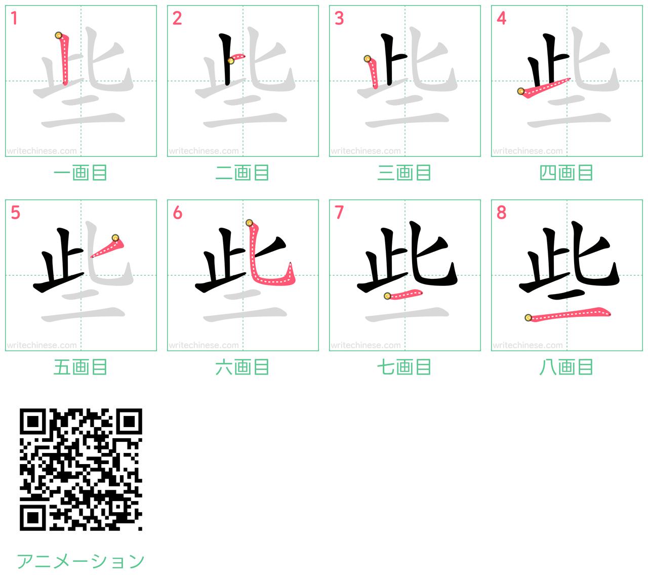 中国語の簡体字「些」の書き順練習用の印刷可能なワークシート 漢字練習帳