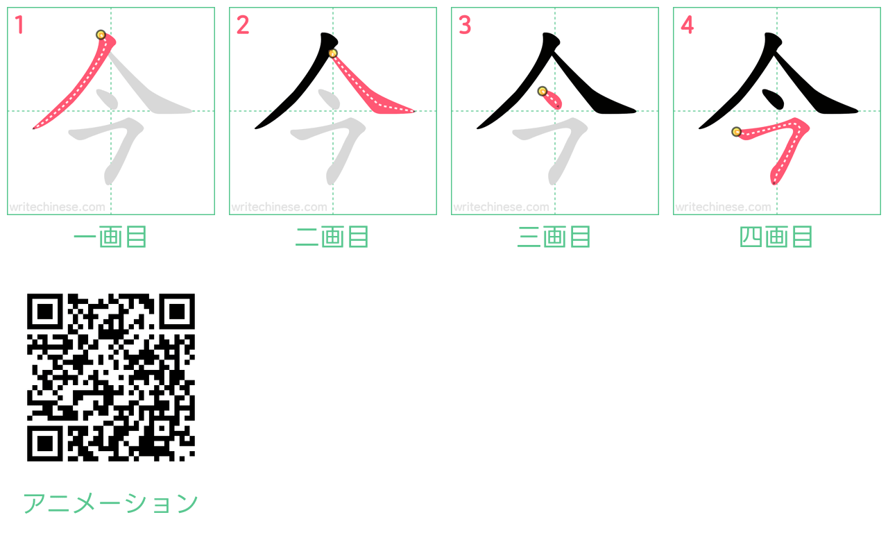 視覚的なステップバイステップの指示を使って、中国語の漢字「今」の書き順を一画ずつマスターしましょう。