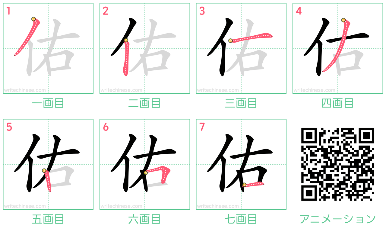 視覚的なステップバイステップの指示を使って、中国語の漢字「佑」の書き順を一画ずつマスターしましょう。