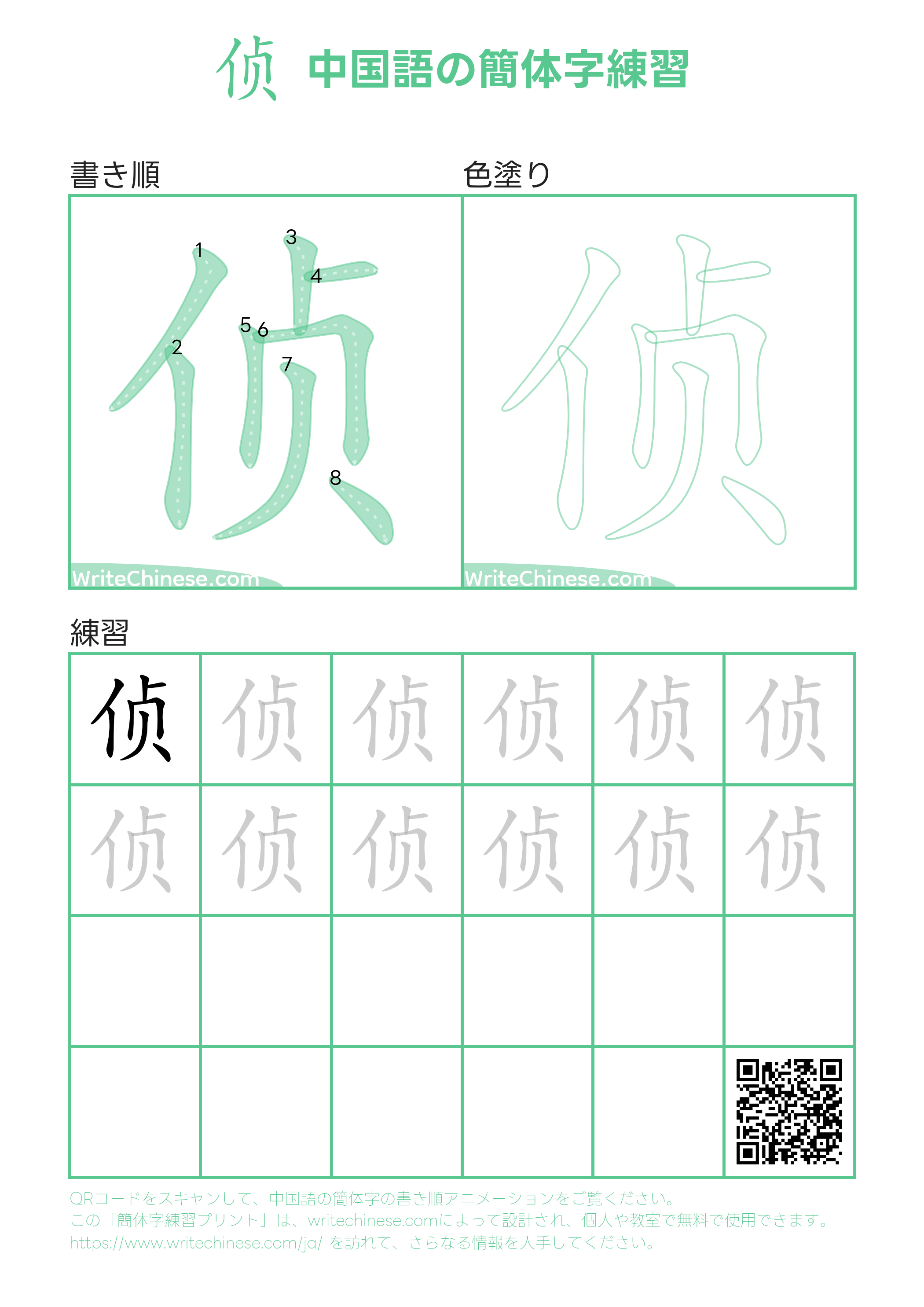 中国語の簡体字「侦」の書き順練習用の印刷可能なワークシート 漢字練習帳