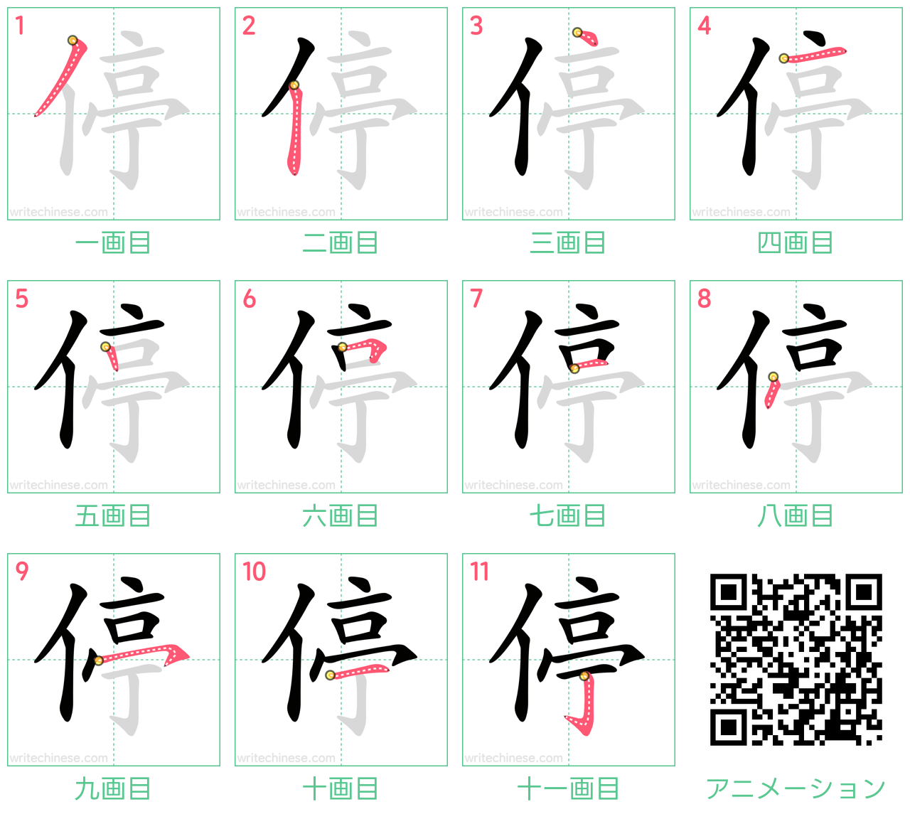 視覚的なステップバイステップの指示を使って、中国語の漢字「停」の書き順を一画ずつマスターしましょう。
