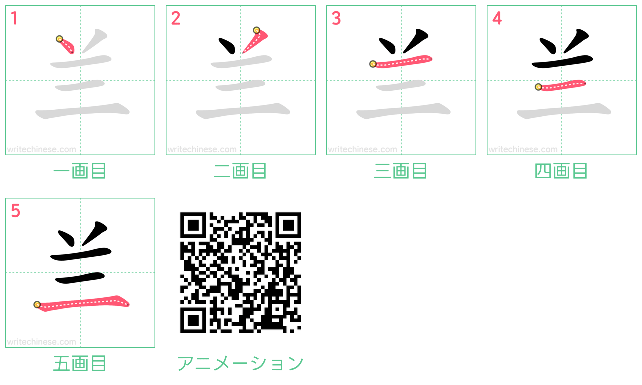 視覚的なステップバイステップの指示を使って、中国語の漢字「兰」の書き順を一画ずつマスターしましょう。