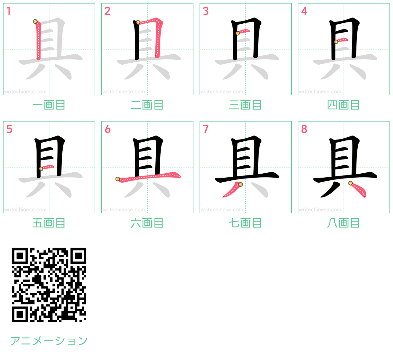視覚的なステップバイステップの指示を使って、中国語の漢字「具」の書き順を一画ずつマスターしましょう。