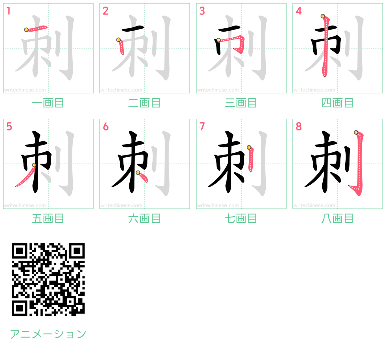 視覚的なステップバイステップの指示を使って、中国語の漢字「刺」の書き順を一画ずつマスターしましょう。