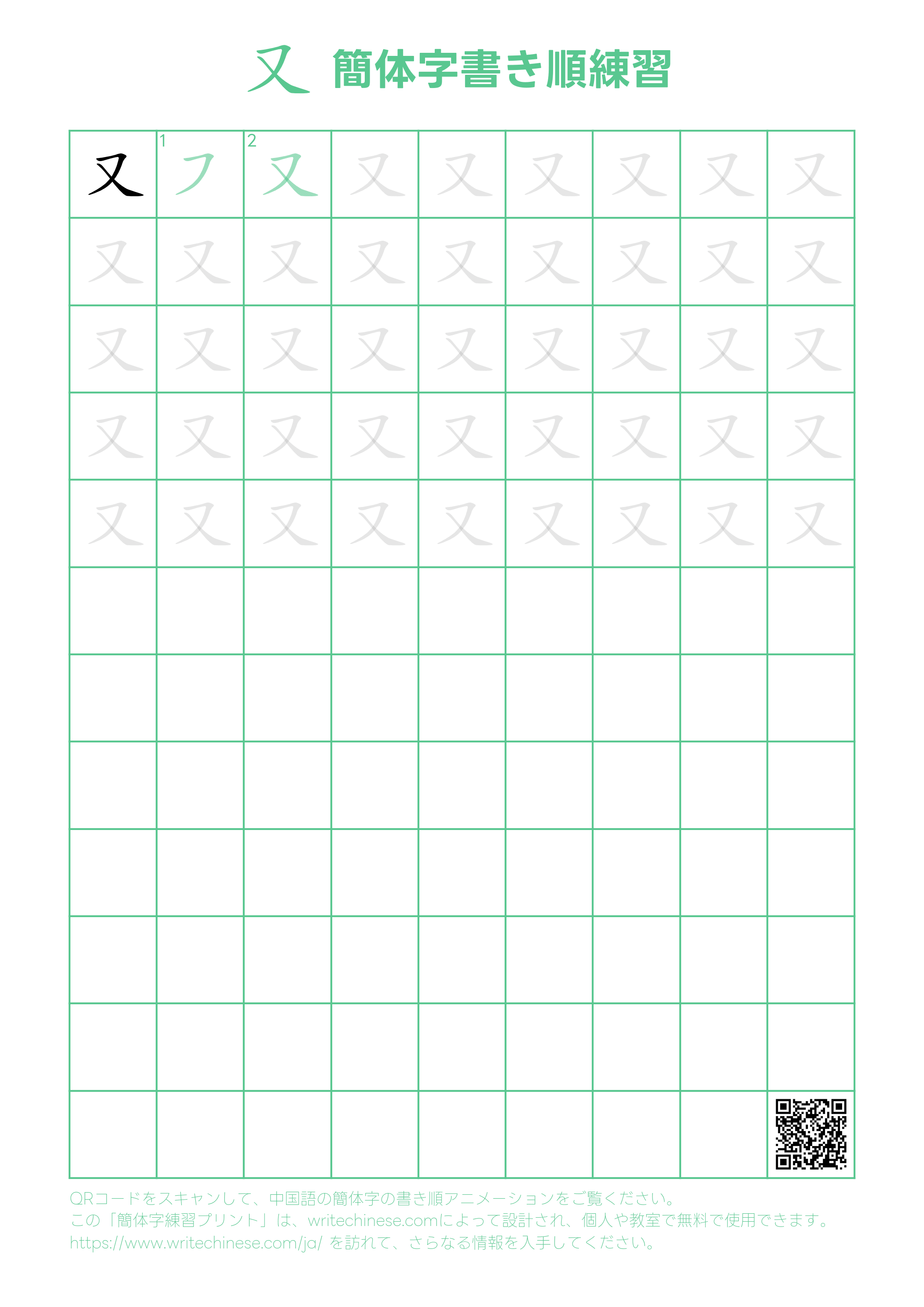 中国語の簡体字「又」の書き順練習用の印刷可能なワークシート
