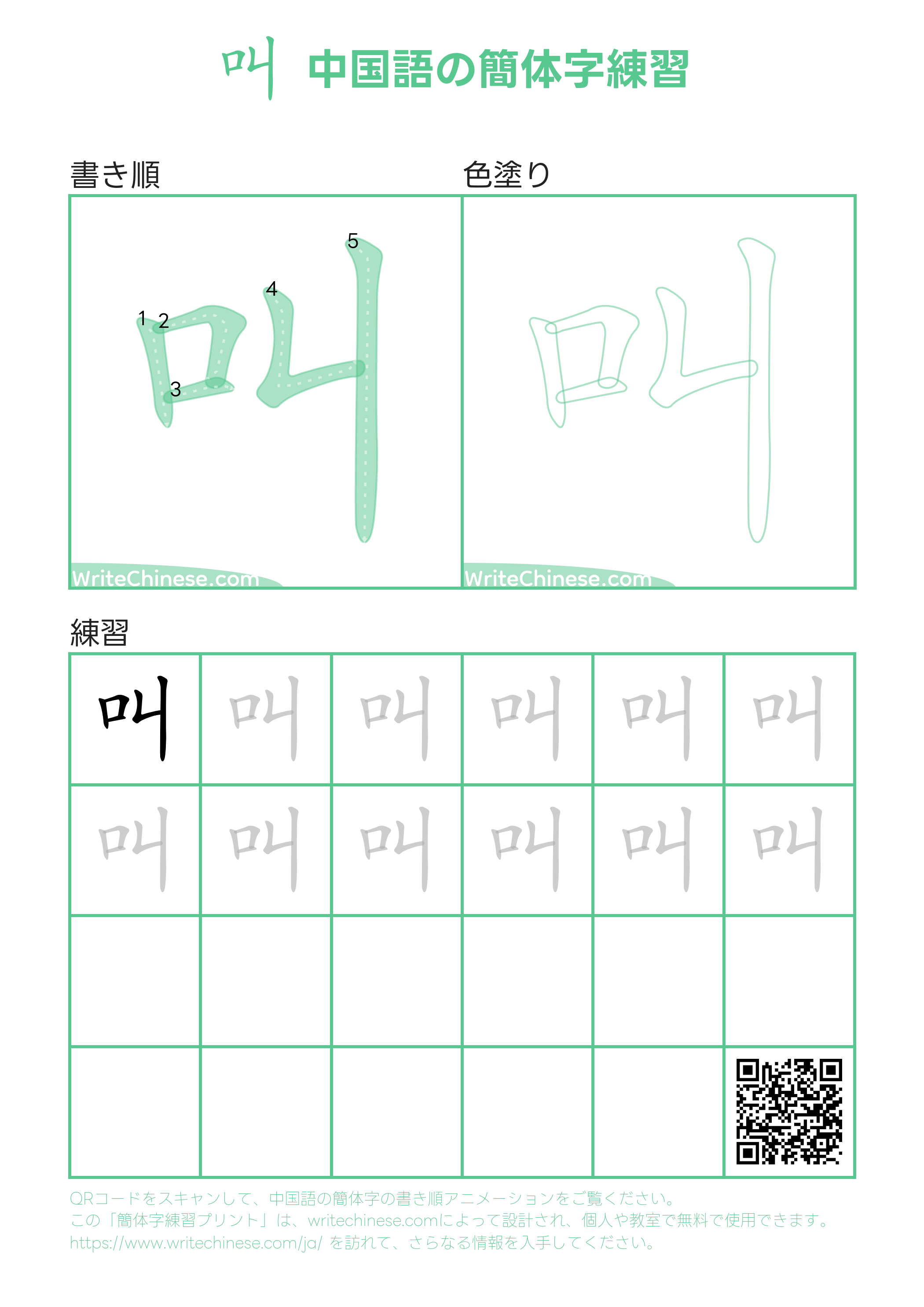 中国語の簡体字「叫」の印刷可能な書き練習用ワークシート 漢字練習帳