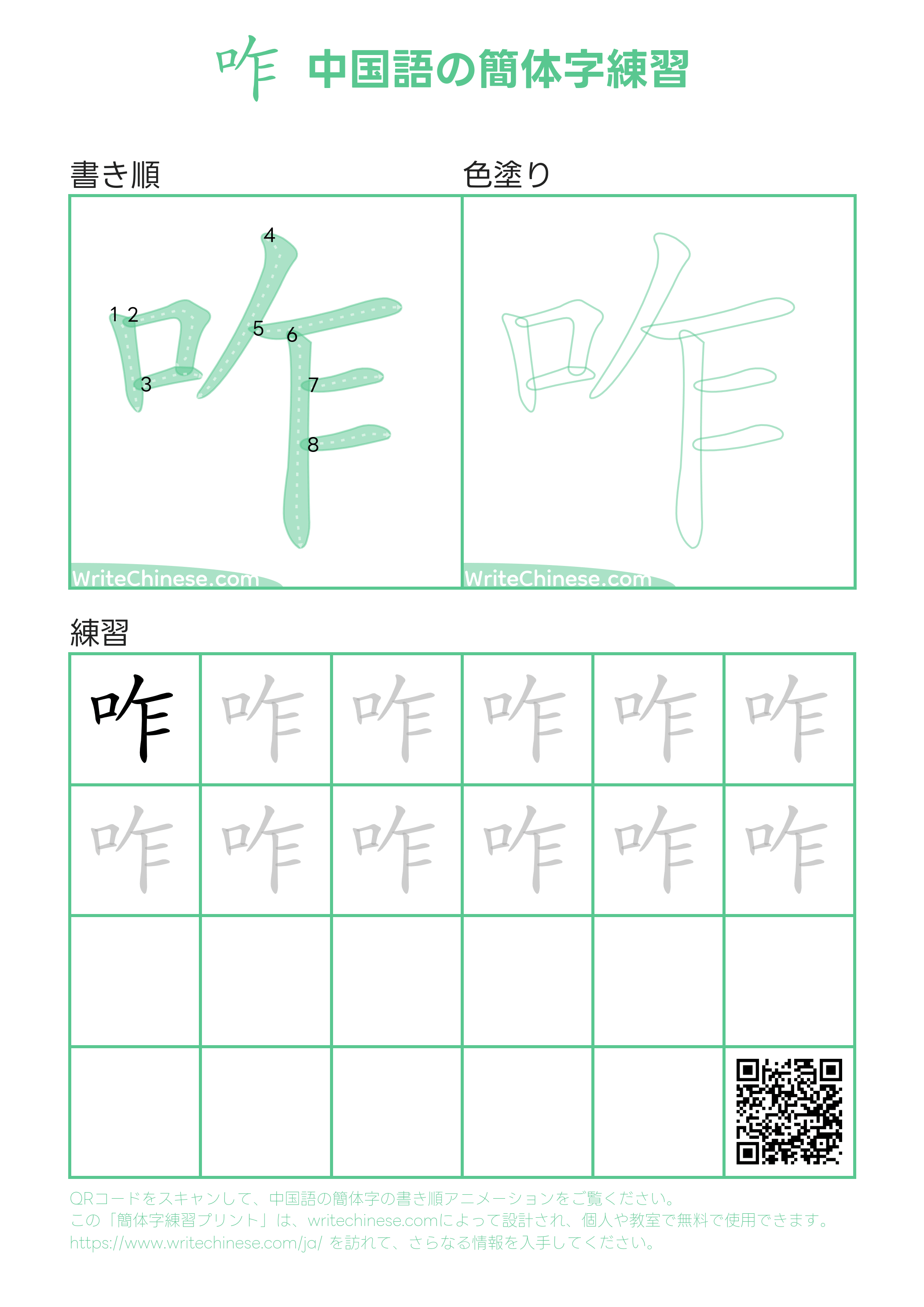 中国語の簡体字「咋」の印刷可能な書き練習用ワークシート 漢字練習帳
