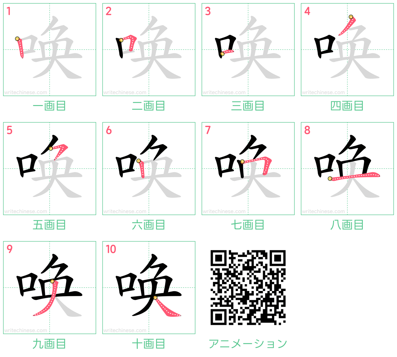 視覚的なステップバイステップの指示を使って、中国語の漢字「唤」の書き順を一画ずつマスターしましょう。
