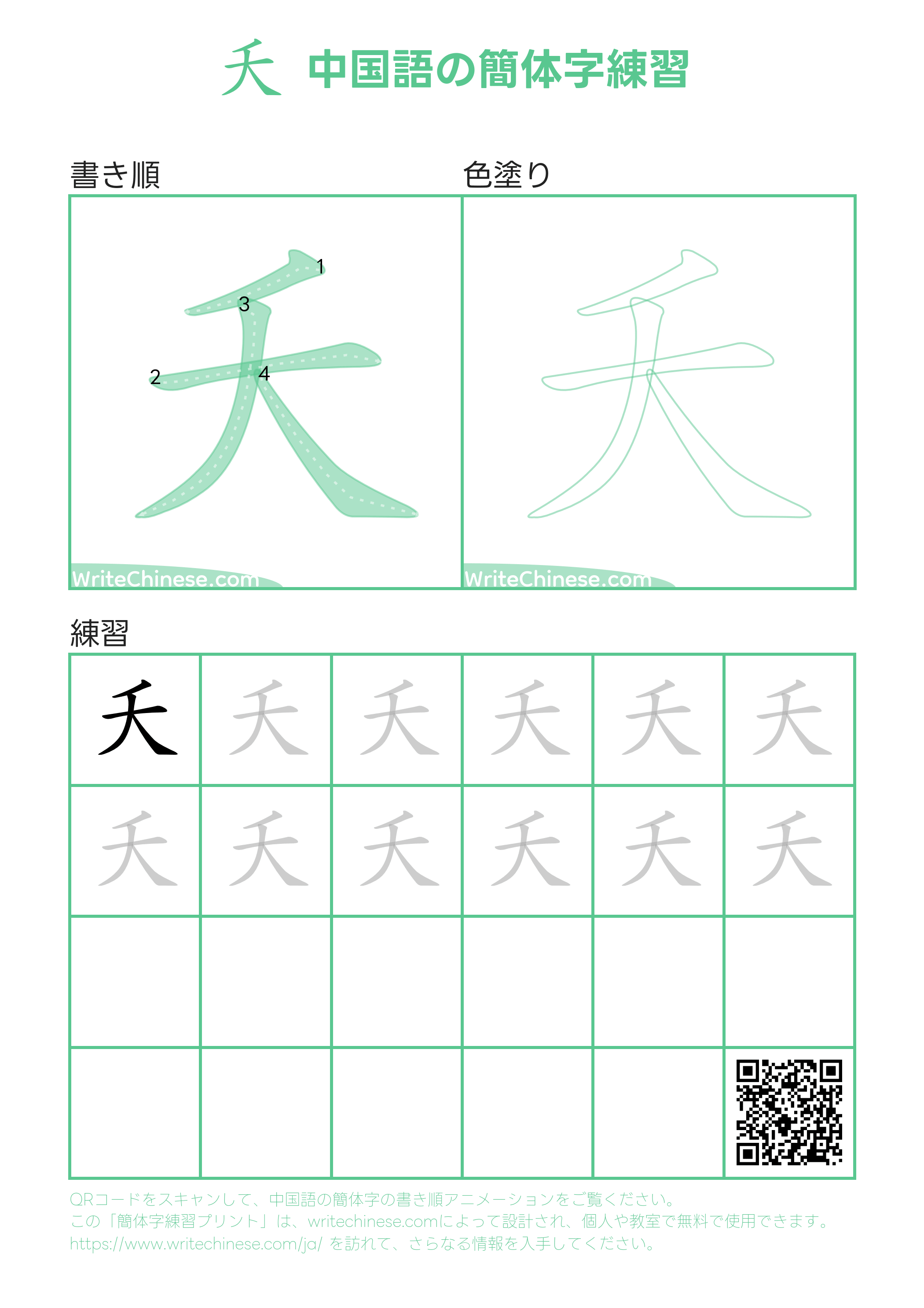 中国語の簡体字「夭」の書き順練習用の印刷可能なワークシート