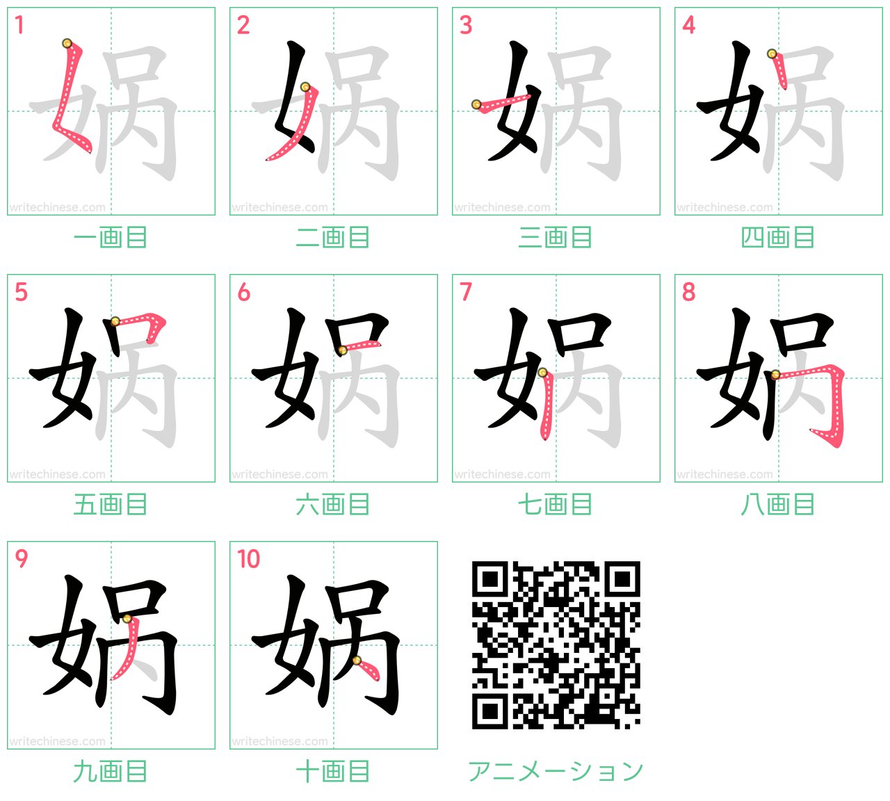 視覚的なステップバイステップの指示を使って、中国語の漢字「娲」の書き順を一画ずつマスターしましょう。