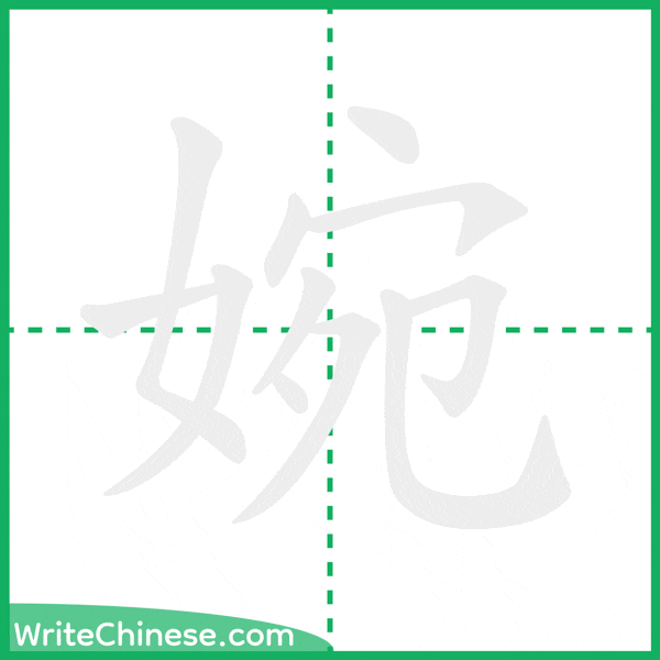 視覚的なステップバイステップの指示を使って、中国語の漢字「婉」の書き順を一画ずつマスターしましょう。