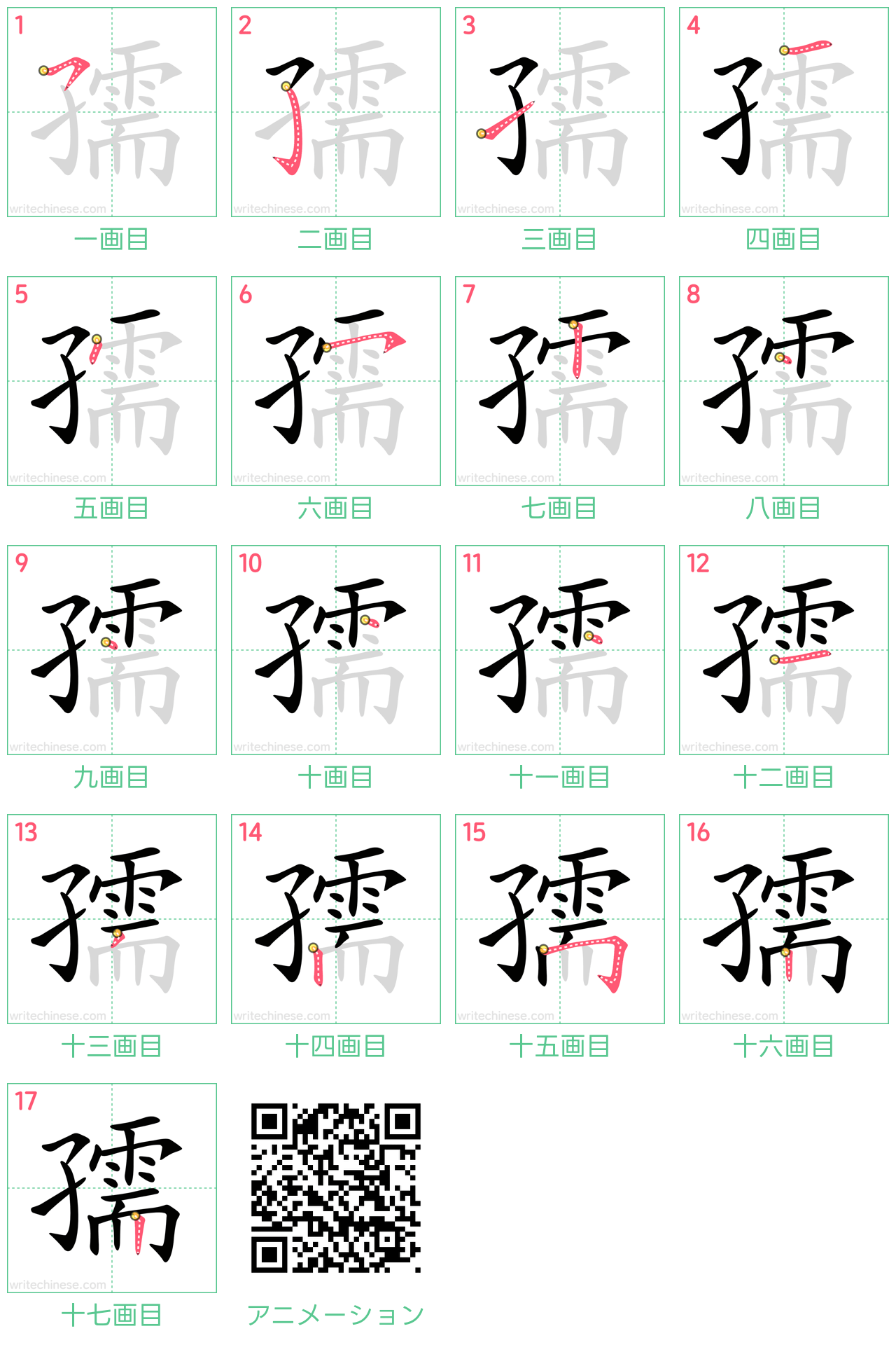 中国語の簡体字「孺」の筆順アニメーションを見て、「孺」という漢字の書き方を学びましょう。