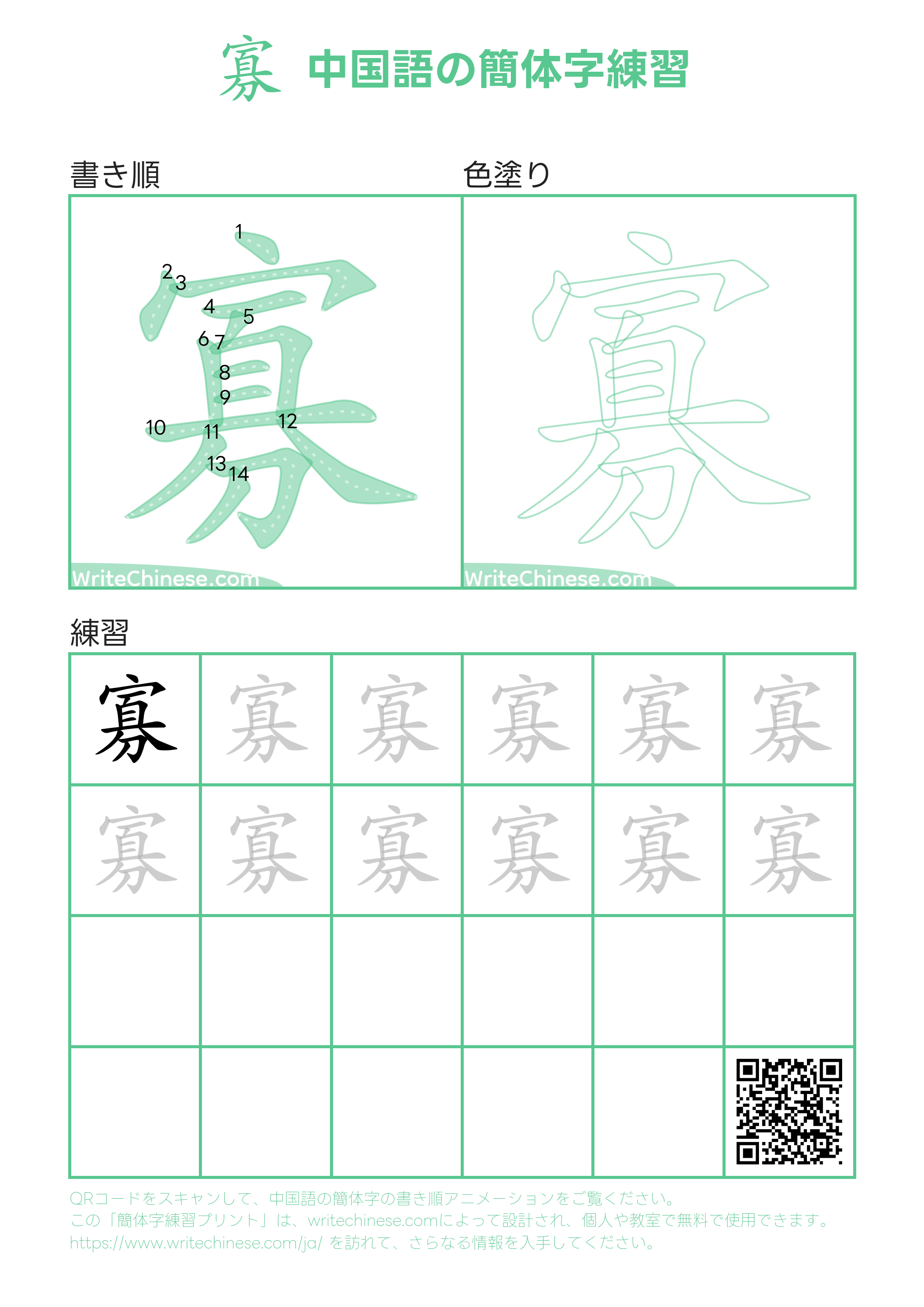 中国語の簡体字「寡」の印刷可能な書き練習用ワークシート