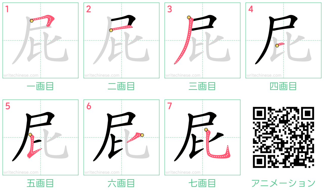視覚的なステップバイステップの指示を使って、中国語の漢字「屁」の書き順を一画ずつマスターしましょう。