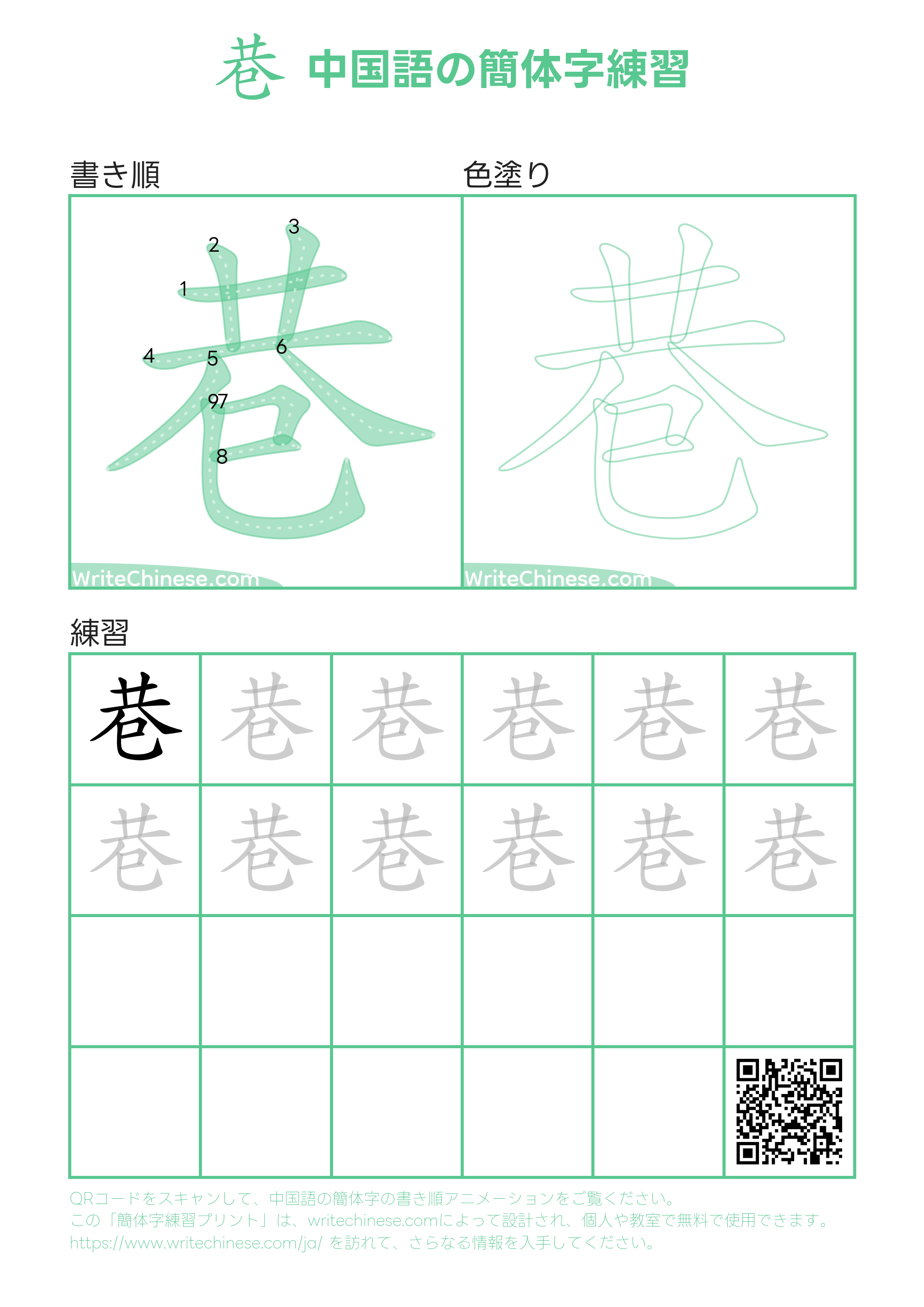 中国語の簡体字「巷」の印刷可能な書き練習用ワークシート 漢字練習帳