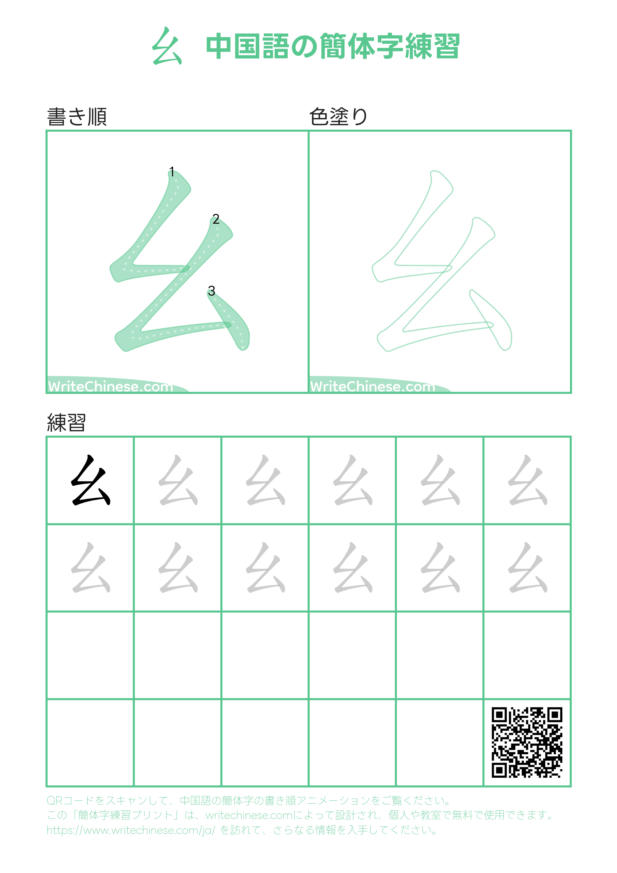 中国語の簡体字「幺」の書き順練習用の印刷可能なワークシート
