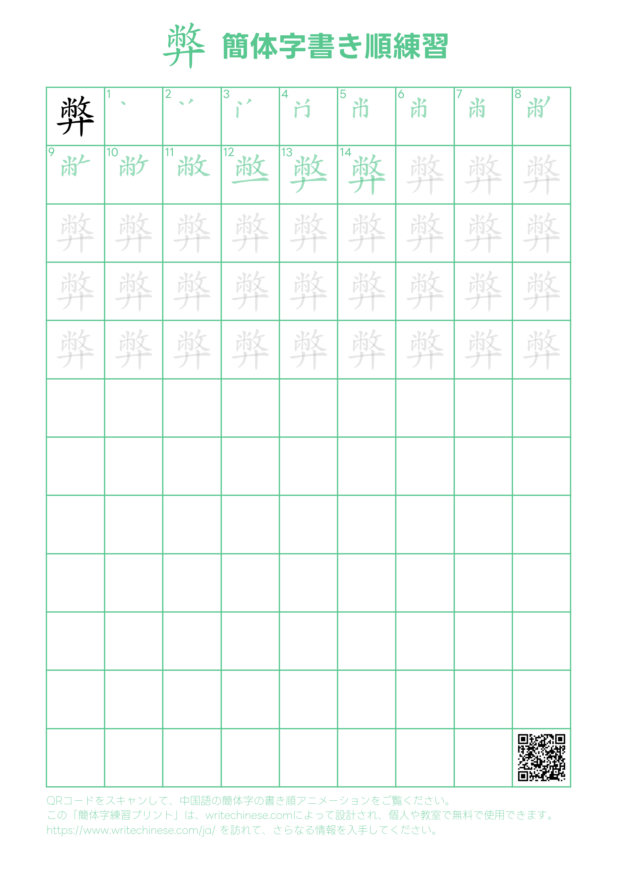 中国語の簡体字「弊」の書き順練習用の印刷可能なワークシート