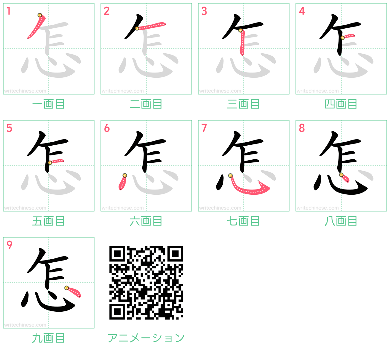 中国語の簡体字「怎」の筆順アニメーションを見て、「怎」という漢字の書き方を学びましょう。