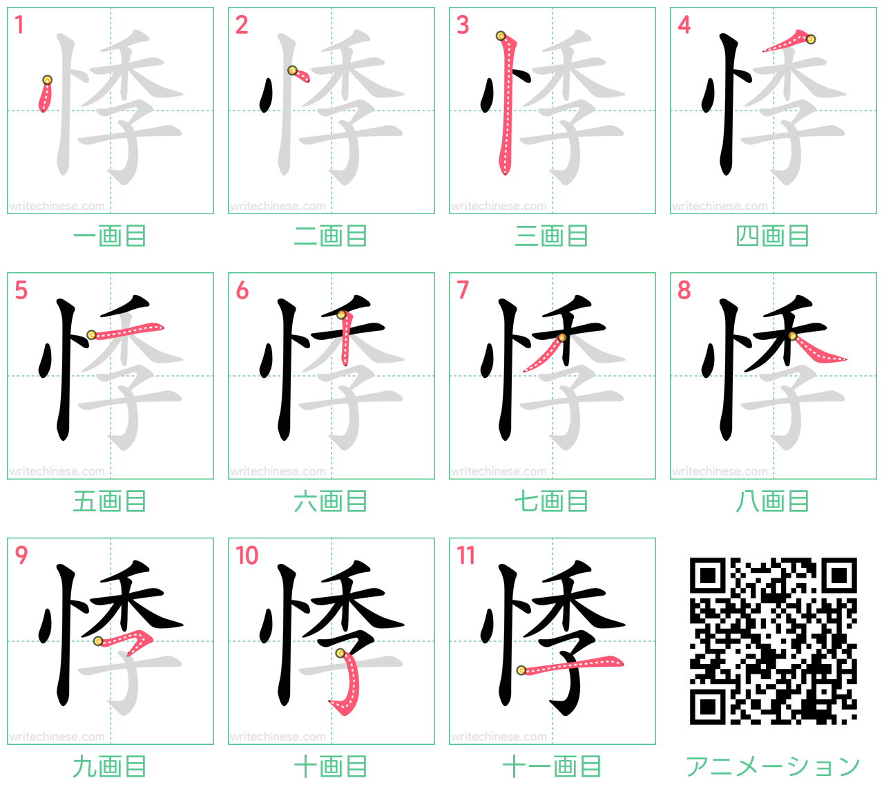視覚的なステップバイステップの指示を使って、中国語の漢字「悸」の書き順を一画ずつマスターしましょう。