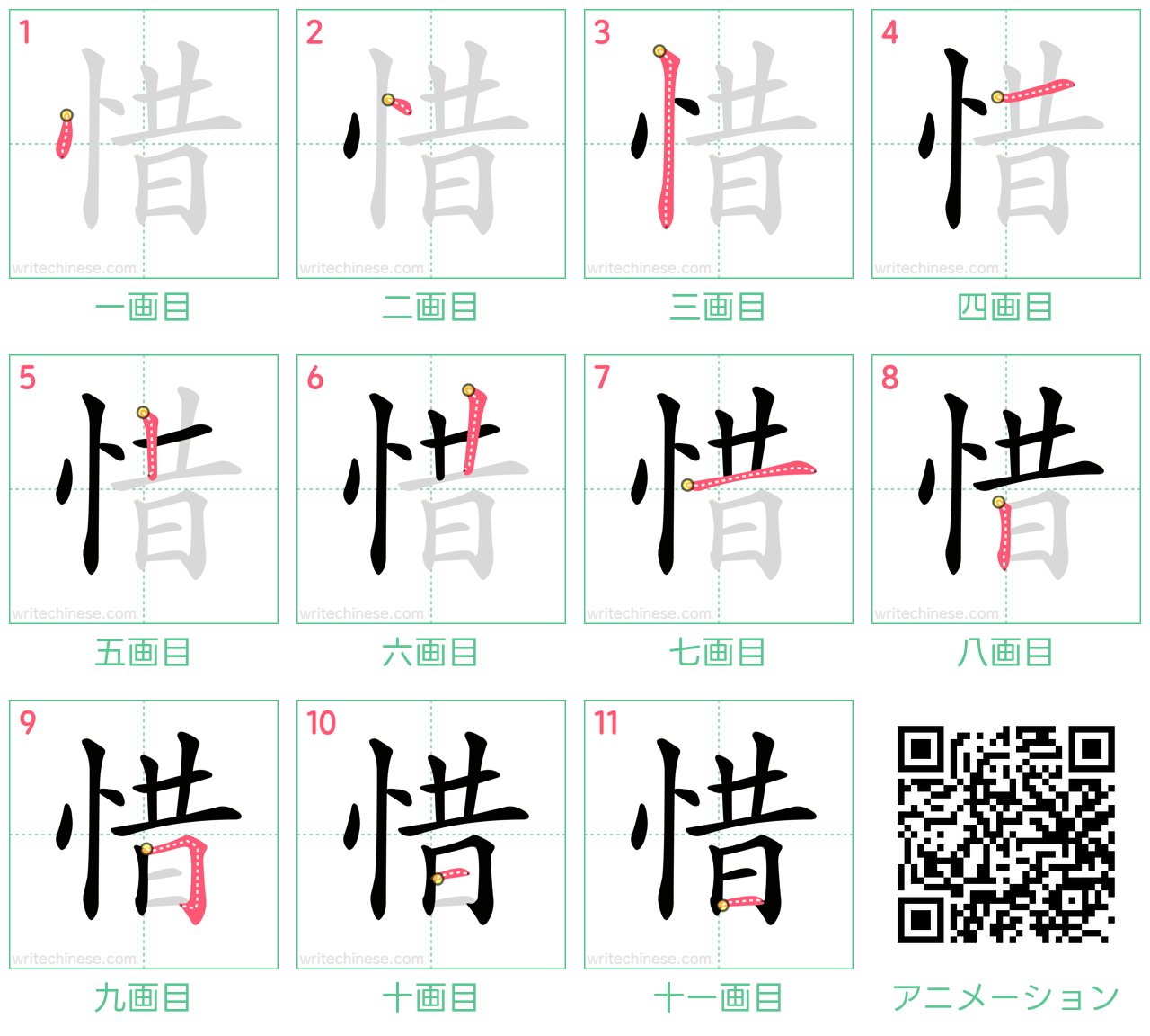 惜 [i] [xī] 〈动〉 【本义】:哀痛,哀伤 【造字法】:形声。从心,昔声。 1 同本义: 【日】同じ意味。 2 珍惜,爱惜,重视而不糟蹋耗费: 【日】大切にする、惜しむ。 3 惋惜: 【日】残念に思う、哀れむ。 4 哀怜、哀悯: 【日】哀れみ、同情する。 5 贪婪,贪求: 【日】貪欲である。 6 吝惜;舍不得: 【日】惜しむ、手放したくない。 1 爱,重视: 【日】愛し、重んじる。 爱~。顾~。怜~。珍~。 【日】愛する、思いやり、珍重。 2 舍不得: 【日】手放したくない。 吝~。~别。~力。~指失掌(喻因小失大)。~墨如金。 【日】惜しむ、分けるのが惜しい、損失を小さくする。 3 感到遗憾,哀痛: 【日】残念に思う、哀しむ。 可~。~悯。惋~。 【日】可惜、哀れ。 【引】 1 《说文》:惜,痛也。 【日】『説文解字』曰く「惜、痛なり」 2 《楚辞·惜誓序》:惜者,哀也。 【日】『楚辞・惜誓序』曰く「惜者、哀なり」 3 汉·贾谊《论积贮疏》:为陛下惜之。 【日】漢・賈誼の『論積貯疏』曰く「陛下のために惜しむ。」 4 宋·苏洵《六国论》:惜其用武不终。 【日】宋・蘇洵の『六国論』曰く「武を尽くすことを惜しむ。」 5 清·袁枚《黄生借书说》:岁月为可惜。 【日】清・袁枚の『黄生借書説』曰く「歳月を惜しむべき。」 【例】 また如:可惜(值得惋惜);痛惜(沉痛地惋惜);惜伤(哀伤) 【日】またのように:可惜(惜しい);痛惜(深く惜しむ);惜傷(哀しみ) また如:吝惜(过分爱惜);怜惜(同情爱惜);珍惜(珍重爱惜);惜玉(对女子的温情爱护);惜体面(爱面子);惜福(富有而不肯过分享受);惜护(十分爱护);惜名(爱惜名声) 【日】またのように:吝惜(惜しむことを過度にする);怜惜(同情し大切にする);珍惜(大切にする);惜玉(女性を優しく思いやる);惜体面(見栄を大切にする);惜福(裕福でありながら過ごしを惜しむ);惜护(非常に大切にする);惜名(名声を大切にする)
